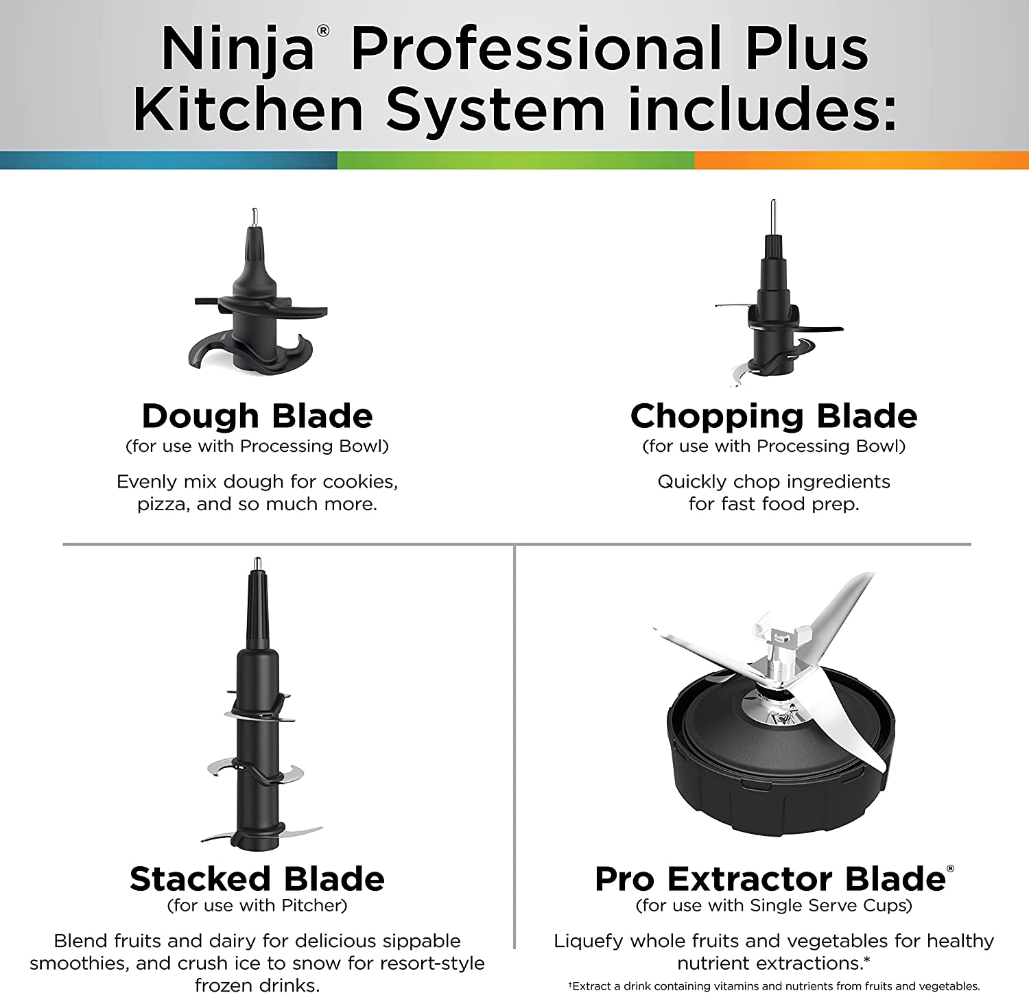 - WHAT'S INCLUDED: 1500-Watt Motor Base, 72 oz. 64 oz. max liquid capacity, 8-Cup Food Processor Bowl, 16 oz. Cup with To-Go Lid, Stacked Blade Assembly, Dough Blade Assembly, Chopping Blade Assembly, Blades Assembly, & Inspiration Guide