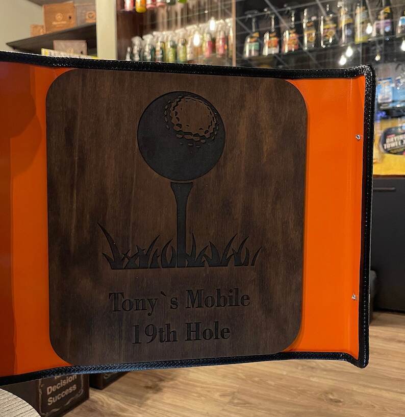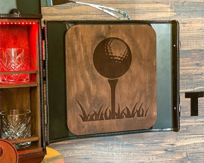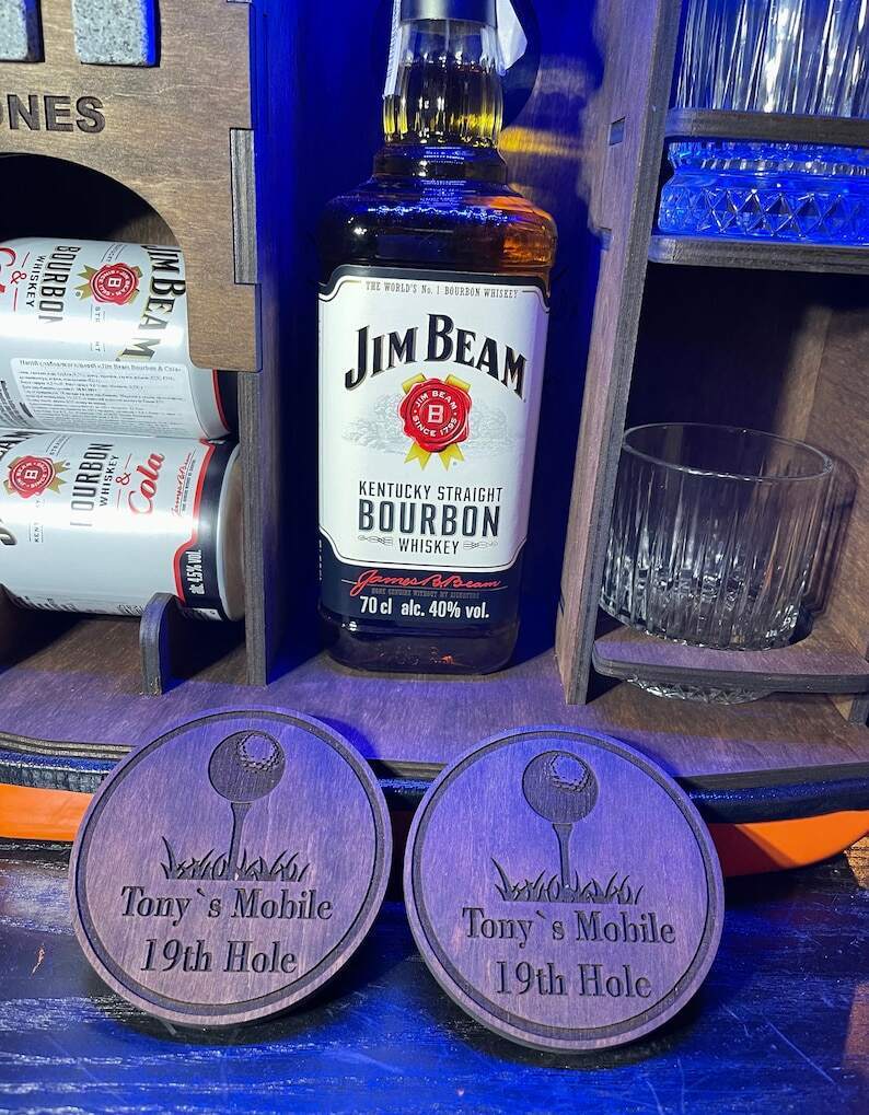 Mini bar that holds a 1L bottle, 2 glasses, 3 Pepsi, whiskey cooling stones and 2 coasters. Inside, on the canister door, we can make engraving on any topic, hobby, sports, hunting, fishing or any other pattern, as well as engraving on the back of the canister and on craters.