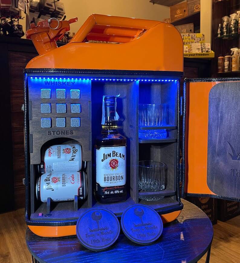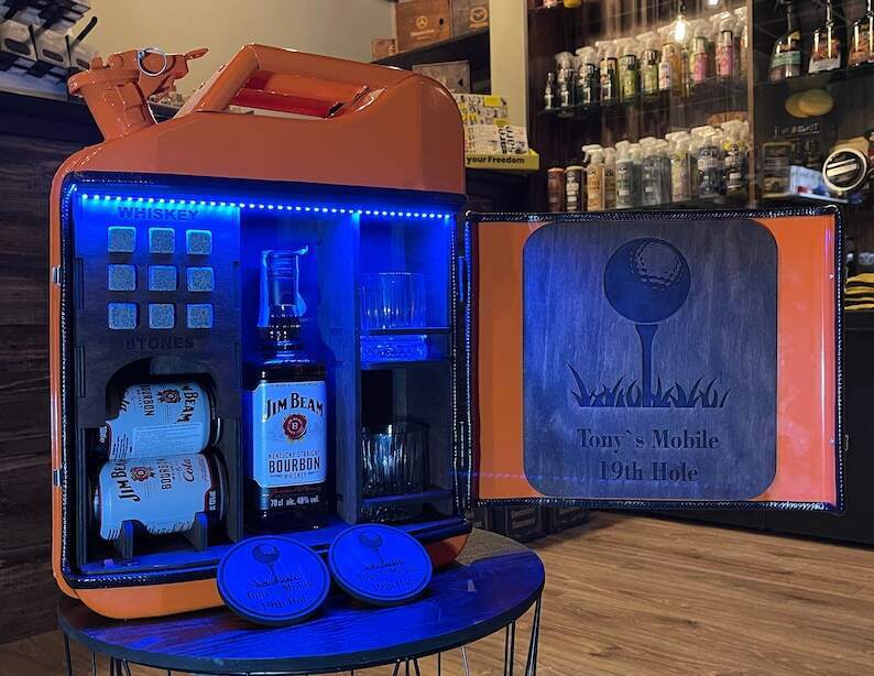 Black metal Jerry can whiskey set with wood inside, Whiskey fuel bar, Personalized Jerry can mini bar, Bar cabinet