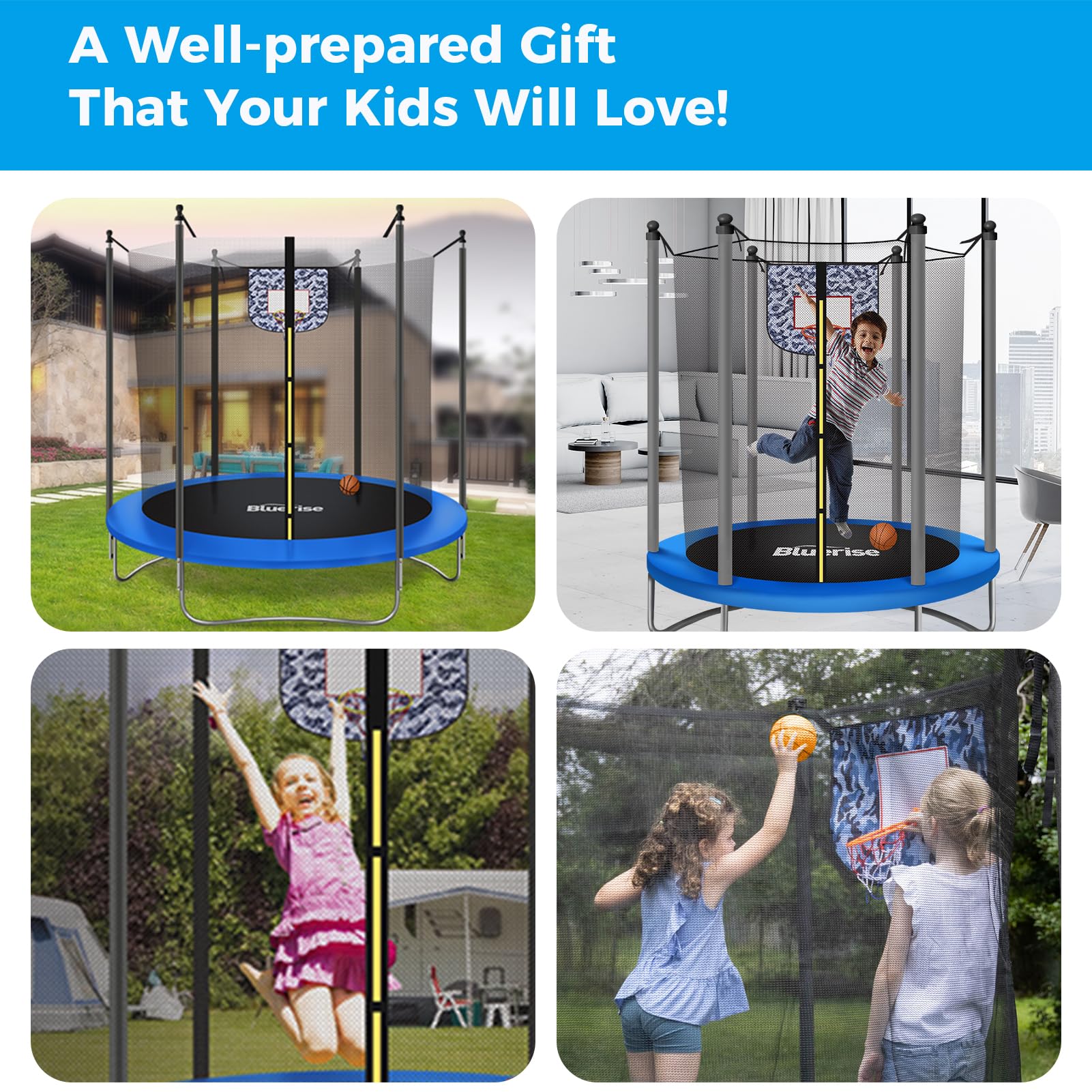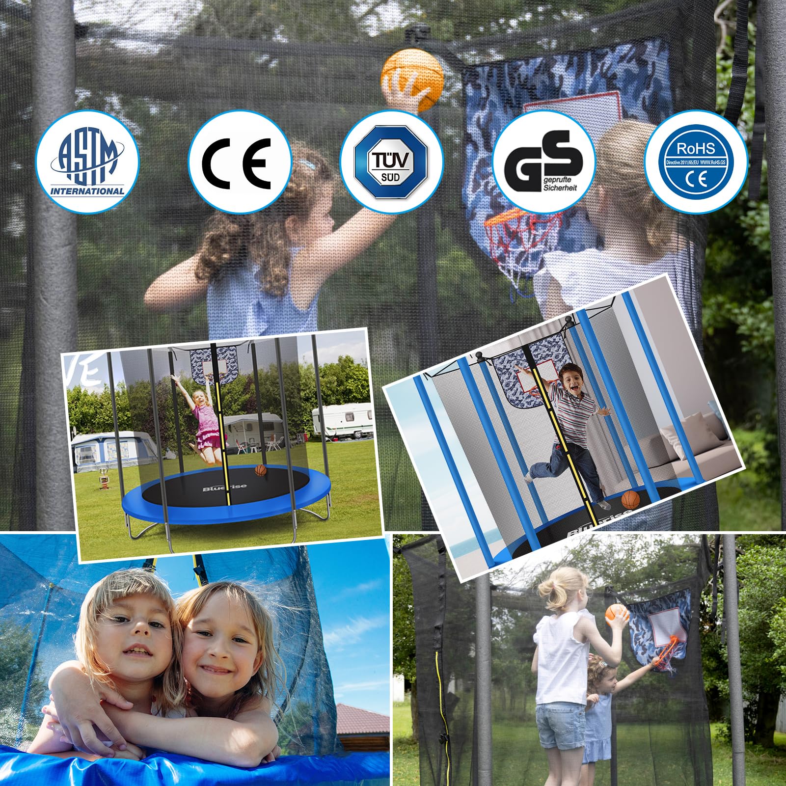 - u3010Guarantee children's safetyu3011 BLUERISE trumpet trampoline has a TUV professional quality inspection certificate to provide children with a safe trampoline experience.