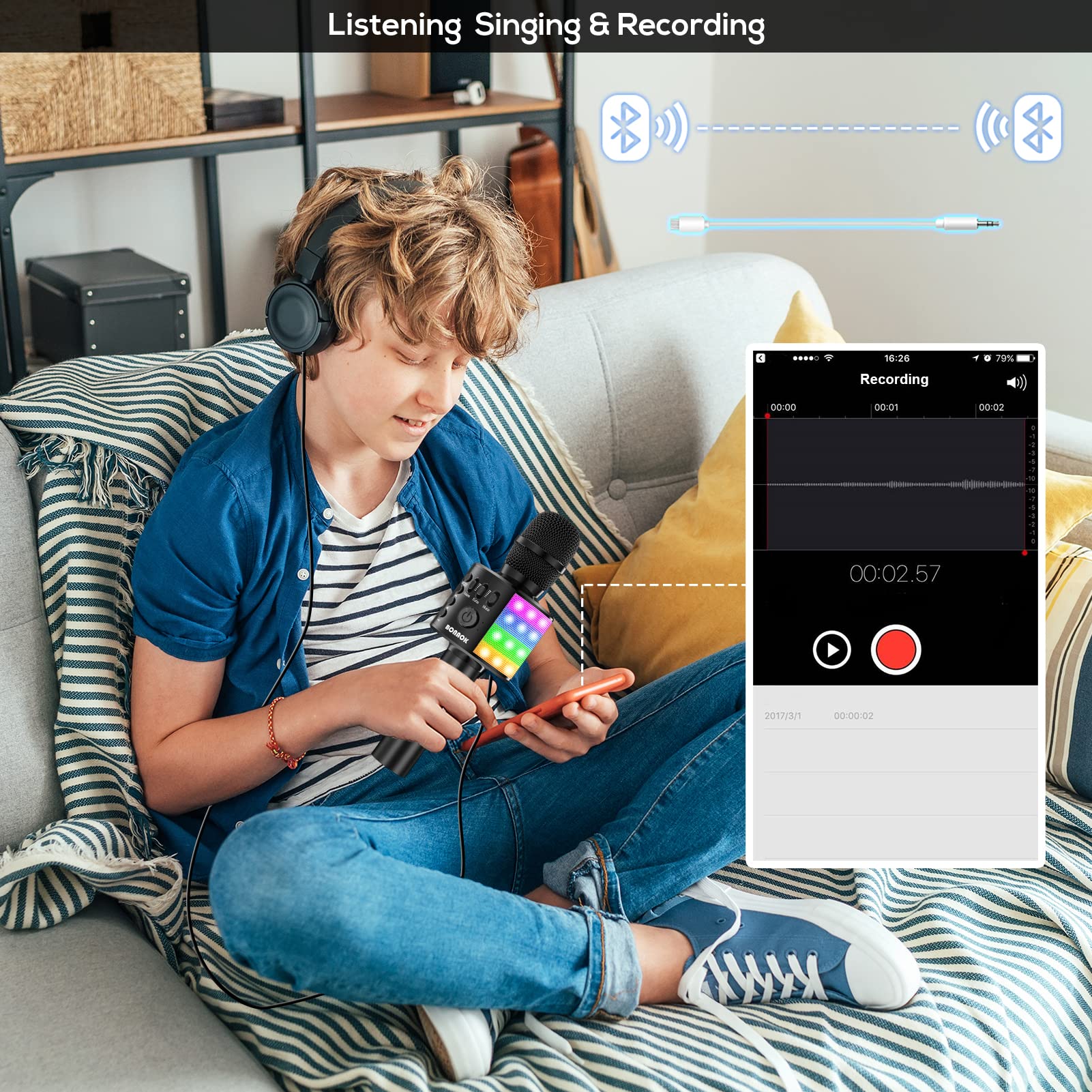 - u3010Powerful Functionsu3011- The Microphone for kids is not only a Bluetooth microphone but also a music player supported to play and record any songs from any app on your phone. Bluetooth has a great distance of connection(10m). Allow the whole family to sing along with music at home, at birthday, Christmas party, or anywhere you want!