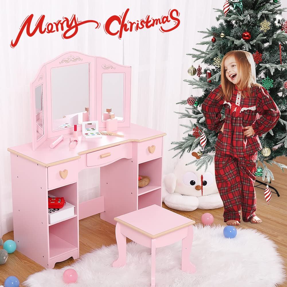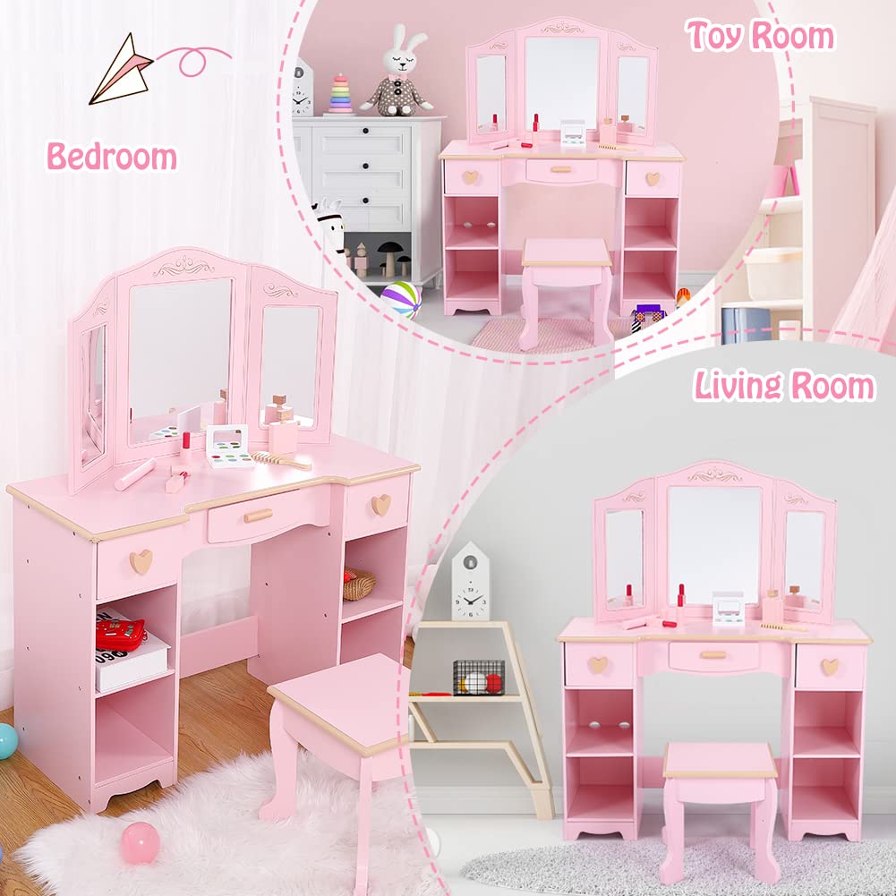 - INCLUDING: The girls' vanity set will come to you with Desk X 1, Stool X 1, Wooden makeup playset X 1. There is Mirror help girls check out their makeup, 3 drawer to store their favorite accessories, 4 Storage Shelves can place their cosmetics, toys, books and other personal items.