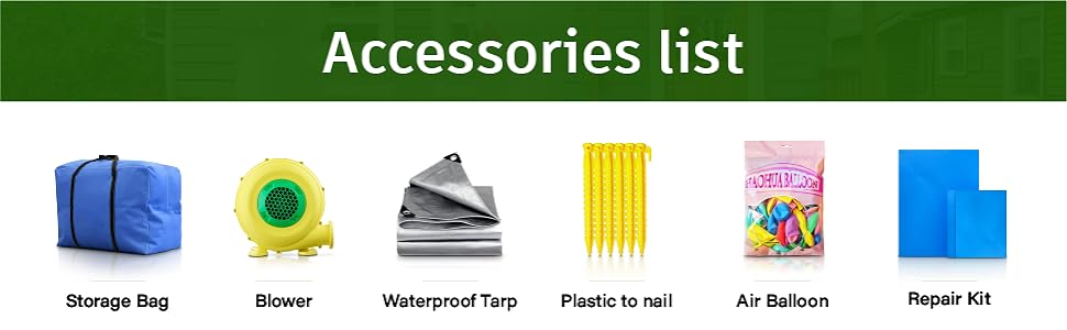- u3010Complete Accessoriesu3011If you worry about the setup and teardown time, don't worry! Our bouncy house comes with a powerful blower. In addition, our order also includes plastic ground nails x 1 set, balloon x 1 bag, repair patch kit, waterproof mat x 1 and storage bag x 1 to make the whole process easier.