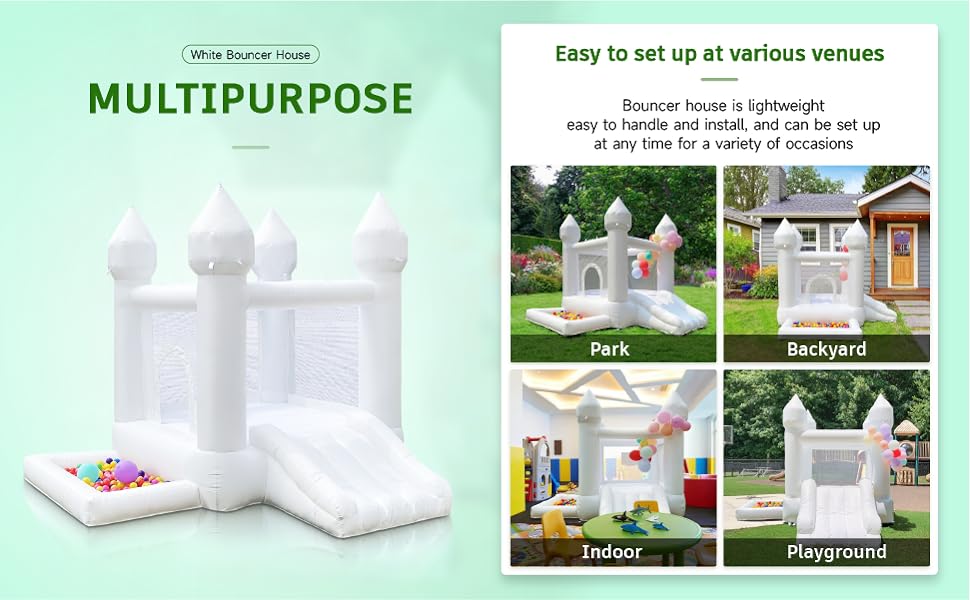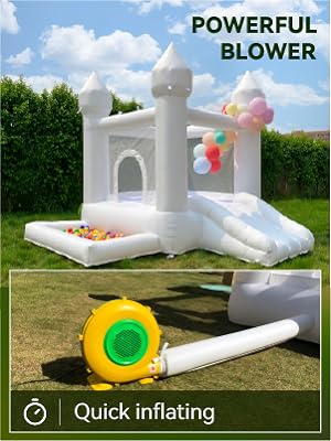 - u3010Easy to set upu3011uff1aThe material of our white bounce house is thinner and durable, making the flexibility softer and comfortable. Easy to inflate and taking it down. About 90 seconds can inflat it, so that toddler to help burn off energy faster.
