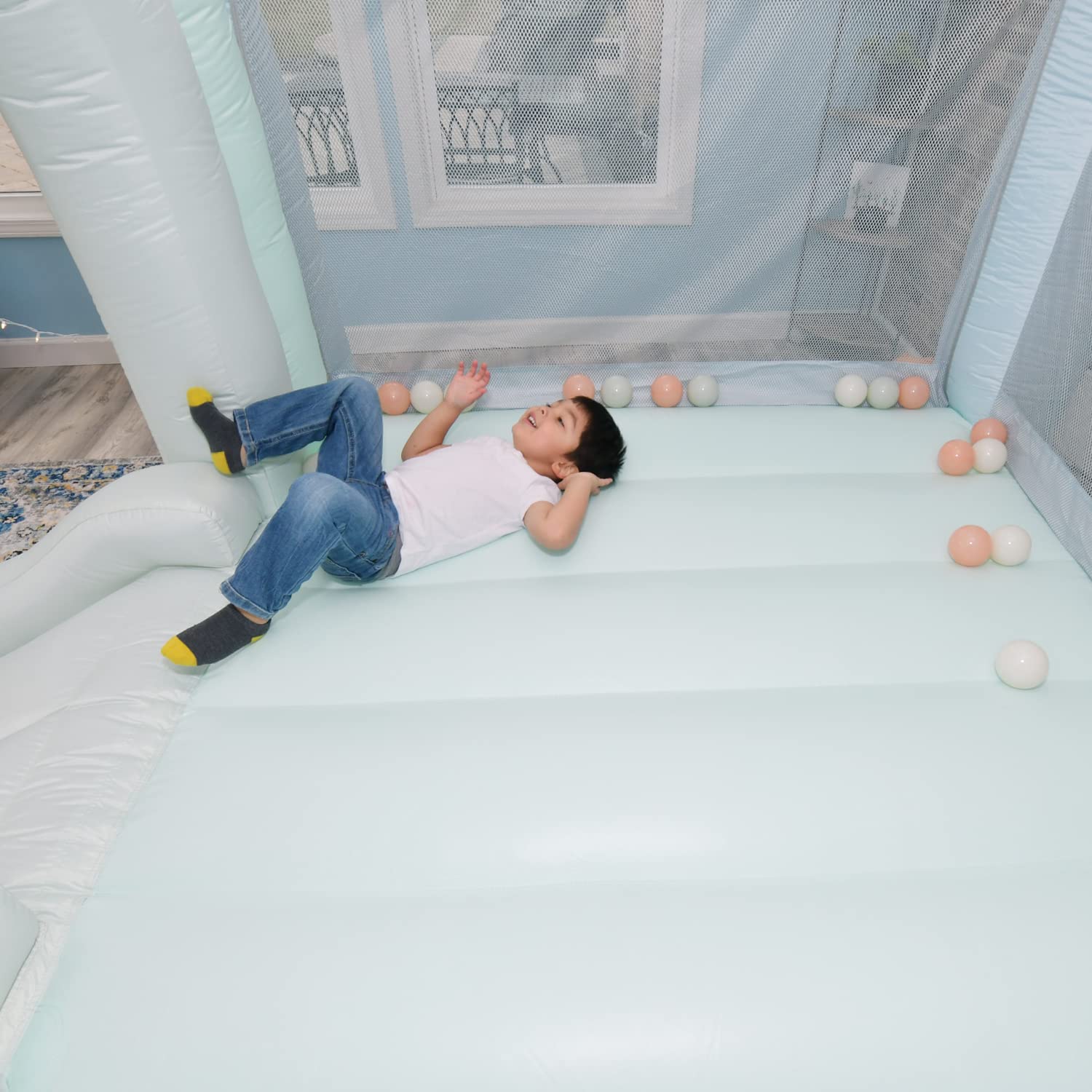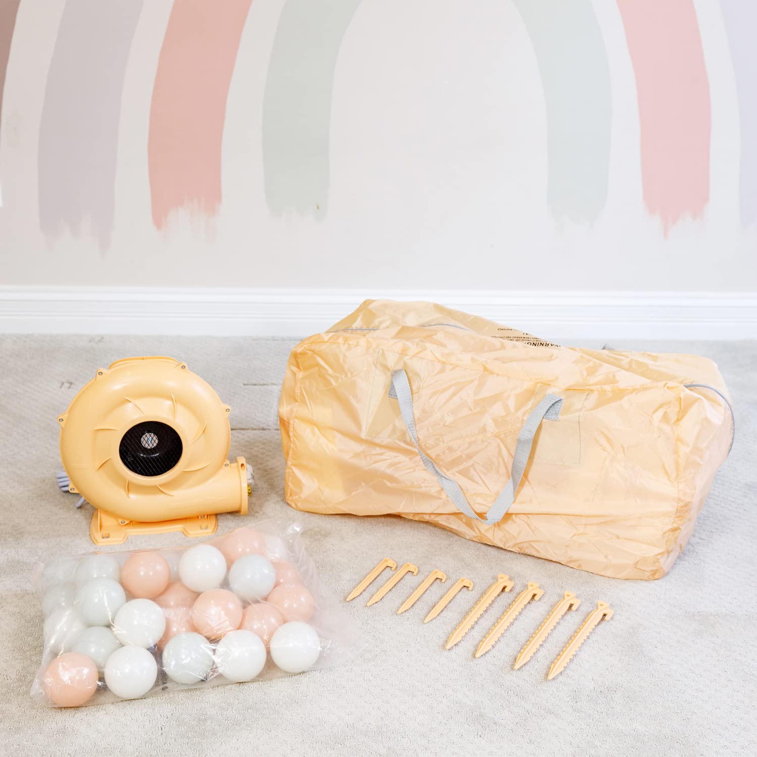 - [Specification] 8.9 ft L x 7.2 ft W x 6.7 ft H inflated size. Package includes: Pastel bounce house, blower, 30 pastel plastic balls, basketball hoop, carry bag, ground stakes, instruction and repair kit. Easy set up and take down, inflates in less than a minute. Perfect for indoor and outdoor use. Carry bag provides easy portability. Trendy design for your home.