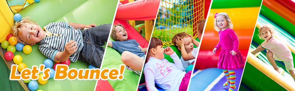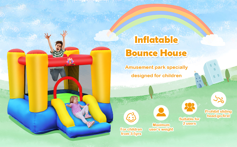 • u3010Endless Jumping & Sliding Funu3011 Let your children jump freely! The bounce house is specially designed for your kids to play with friend (Jumping area dimension: 5.2 x 5.2 ft, kids in the age of 3-5. Maximum number of children: 2, Total weight limit: 200lbs, Individual weight limit: 100lbs). There is a inflatable slide connected with the jumping area. Kids will love sliding out of the bouncer and getting in to jump through the door aside.