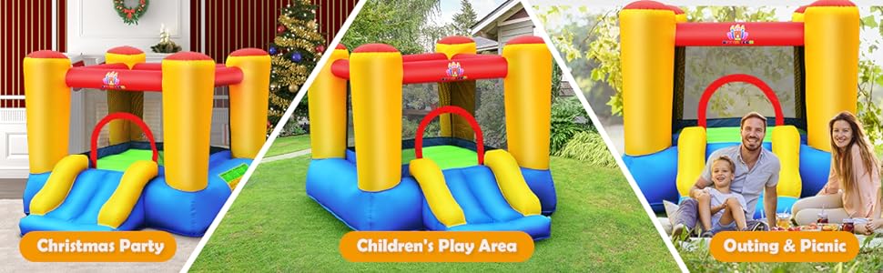 • u3010Ideal Kid's Gift Suitable for All Seasonsu3011 The toddler bounce house will delight children for all the special event and as a great present for birthday, Halloween, Christmas or any holiday seasons. There is no seasonal or locational restriction to play on this bounce house for your little ones. During winter, you can set it indoors on the floor to fully liberate their energy. In summer, take it out to keep on the ground with bouncer stakes for extra stability.