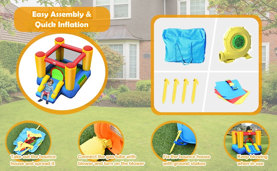 • u3010Sweet Accessoriesu3011 The castle jumper bouncer comes with 4 ground stakes for securing the stability and firmness of the entire castle bouncer. A pack of repairing accessories used for easy maintenance and a carrying bag provided for easy storage and transportation. It is an ideal present for your kids on birthday or Christmas!