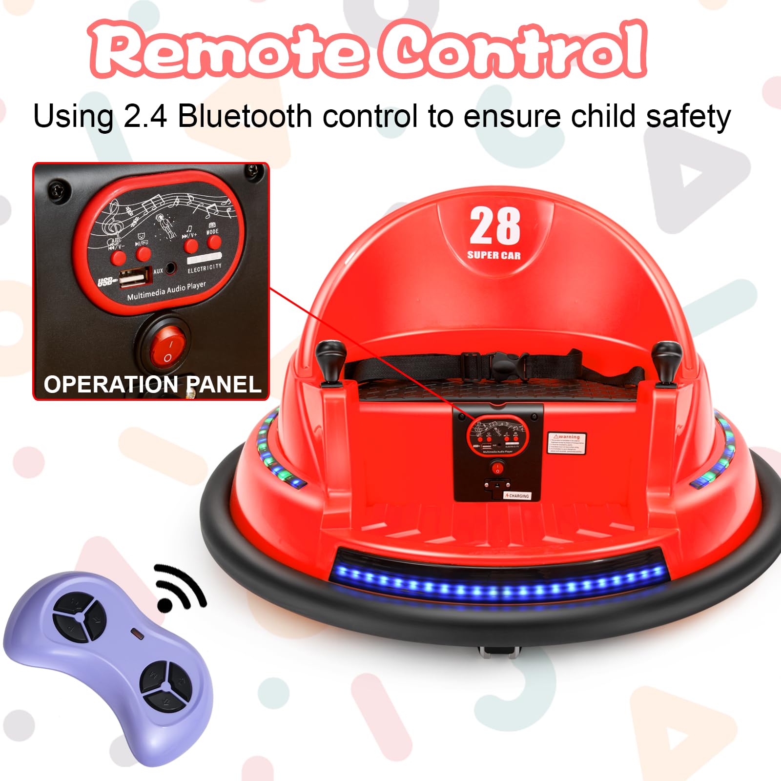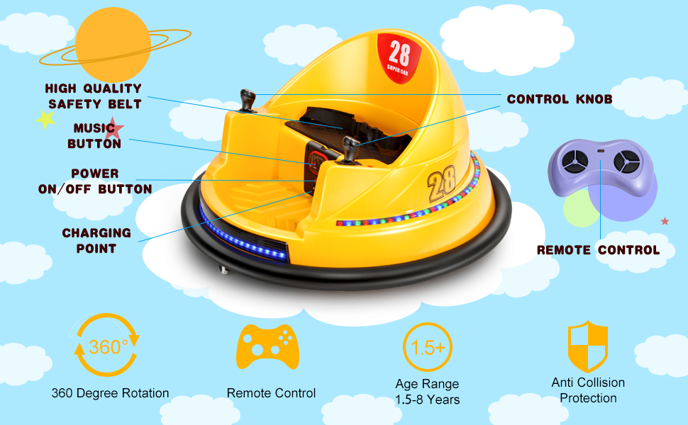 - Safety features - ASTM-certified to this bumper car and comprise a safety belt, anti-flat tires and Light. Recommended for children aged 1.5 to 8 years old.