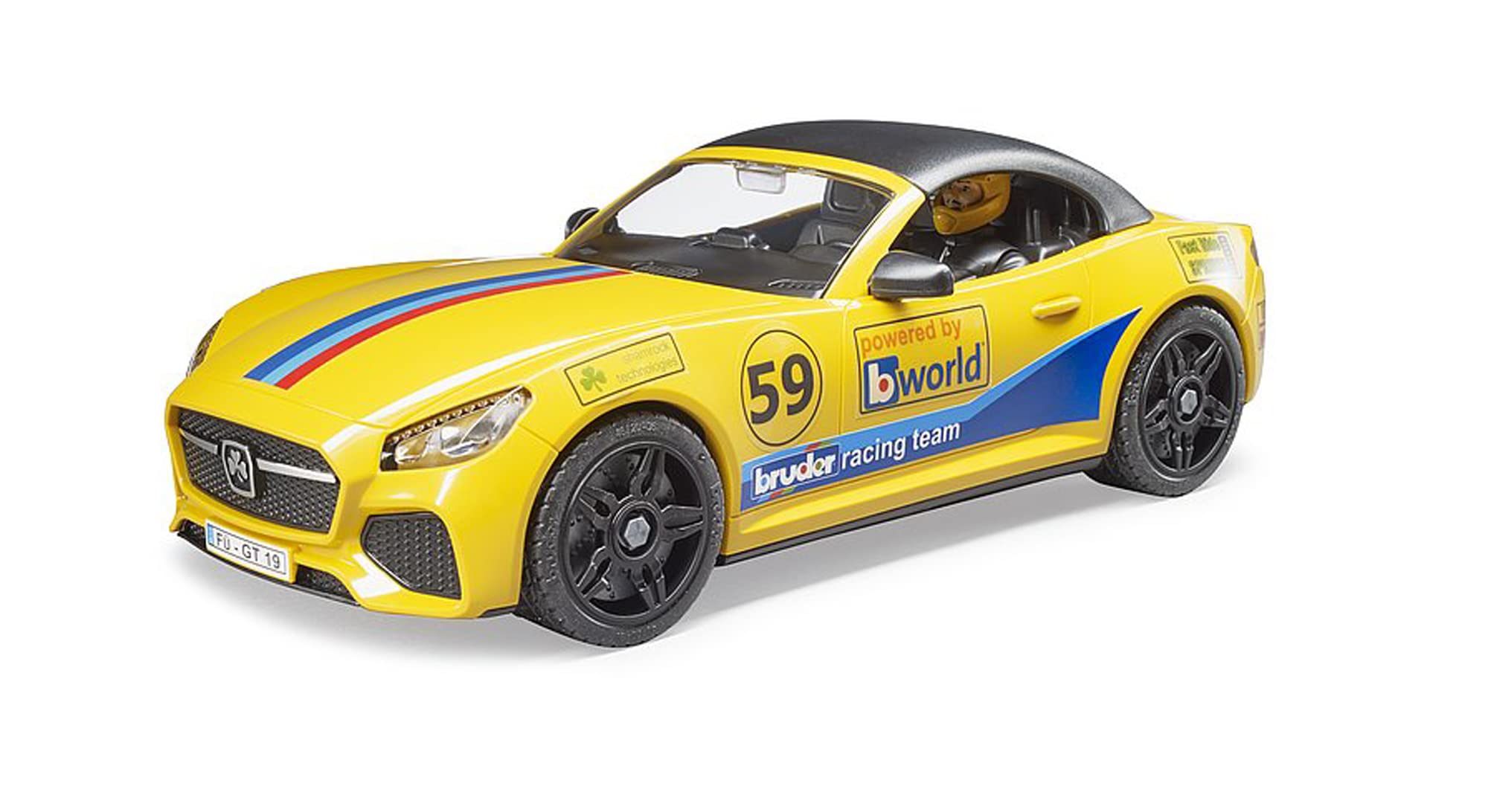 - Contains: Ram truck, driver with helmet, Bruder roadster and trailer