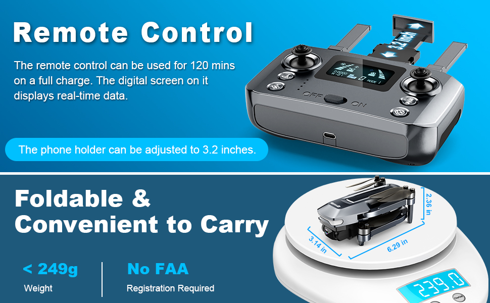 - u3010Intelligent Controller with LED Screenu3011: The battery level of the drone and remote controller, GPS signal and Flight Height are shown on the controller LED screen, which is convenient to track the flight in real time. Remember to remove the scratch-proof film on the controller before use.