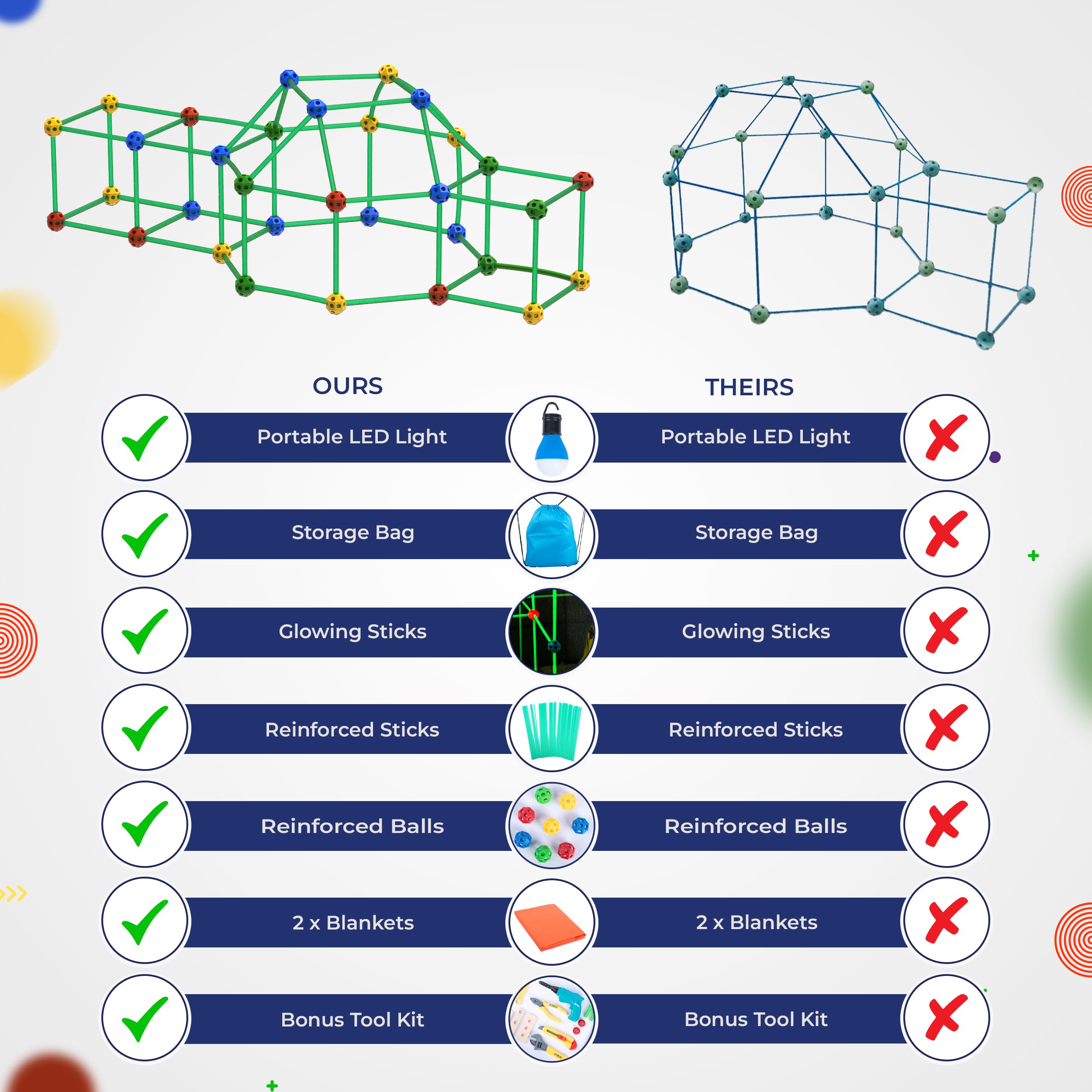 - u2714ufe0fPLAY: Unleash endless hours of family fun by connecting the balls and sticks to bring your child's wildest imagination to life. Whether it's a fort, cave, tunnel, igloo, playhouse, or castle, our kit has it covered. Add a blanket for an exciting play space, perfect for both indoor and outdoor adventures. And don't forget the tool kit for even more creative possibilities!