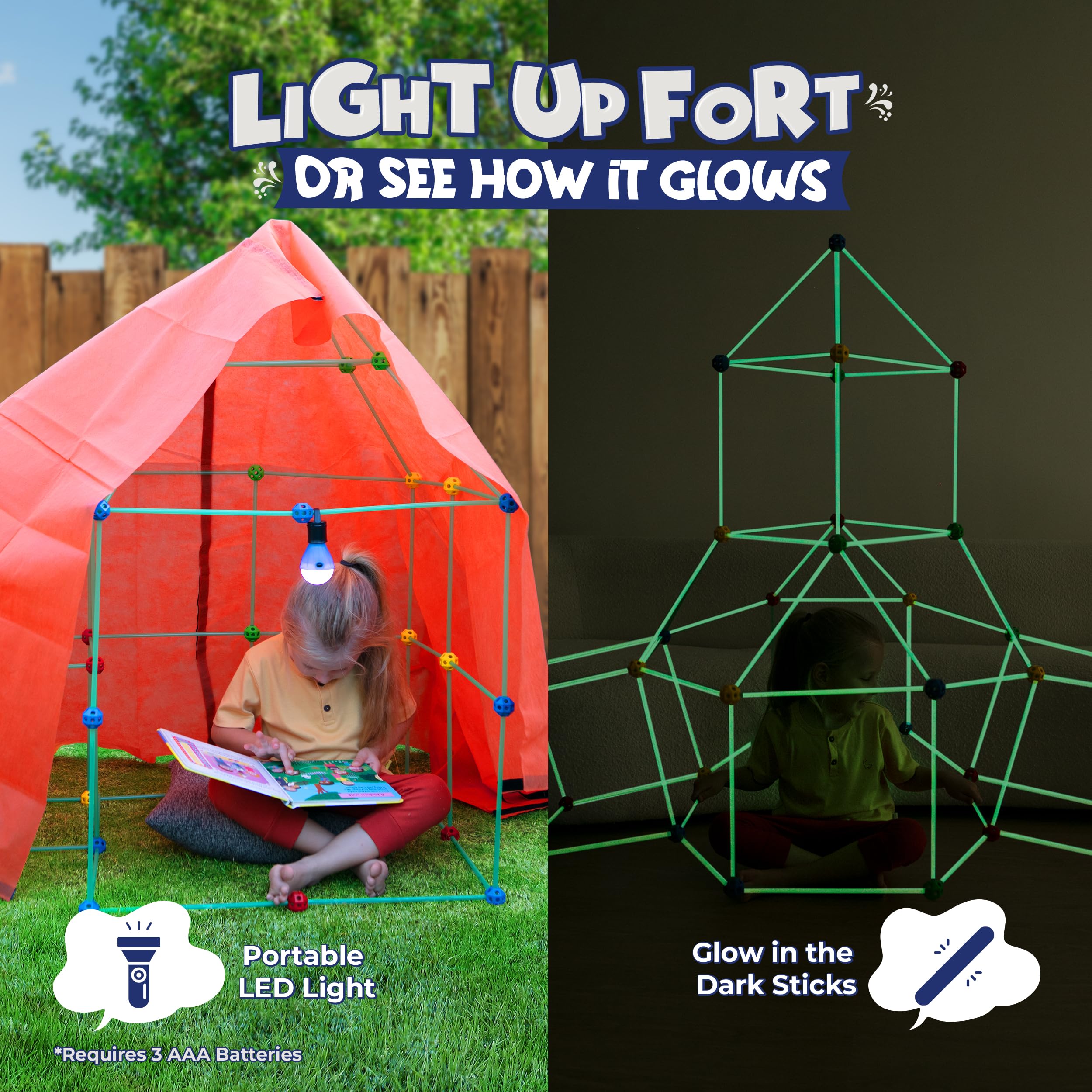 - u2714ufe0fVALUE: Our Fort Building Kit offers unbeatable value with 130 pieces, including 85 glow-in-the-dark magic reinforced sticks and 45 sturdy balls. It also comes with a portable light, a kids' play tool kit, 2 blankets, and a convenient storage bag u2013 everything you need to create the perfect fort.