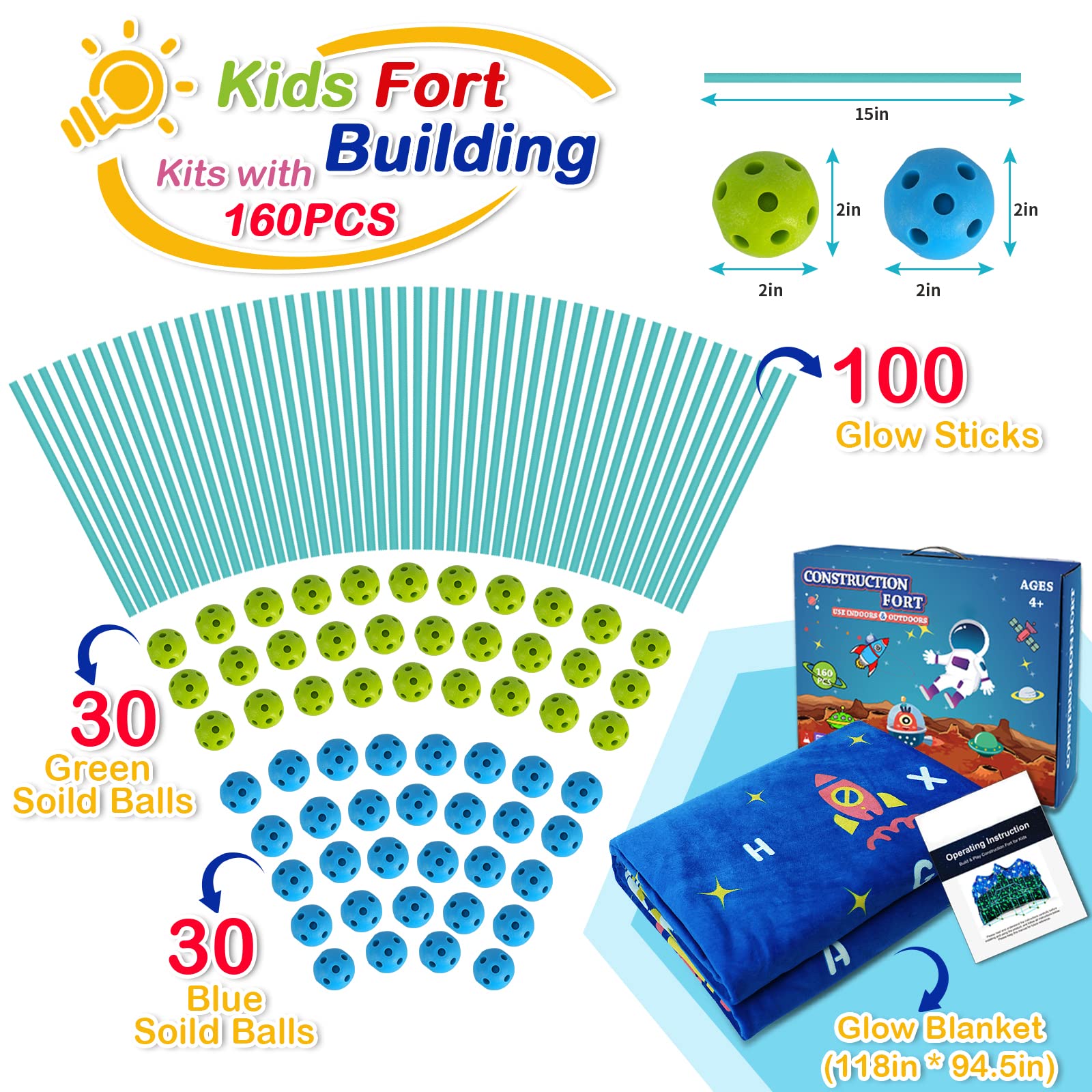 - u3010Ideal Educational Gift for Kidsu3011: STEM fort building toys includes 100u00d7Glow Sticks,30u00d7Blue Soild Balls,30u00d7Green Soild Balls and 1u00d7Glow Blanket(long:118in,wide:94.5in). Compared with other children's fort building toys on the market, 160PCS fort building kits to meet the needs of kids to DIY build forts of all shapes and sizes! A large blankt can cover any shapes of fort! Construction fort kits toy is ideal gift for 4 5 6 7 8 9 10 11 12 Years Boys & Girls.