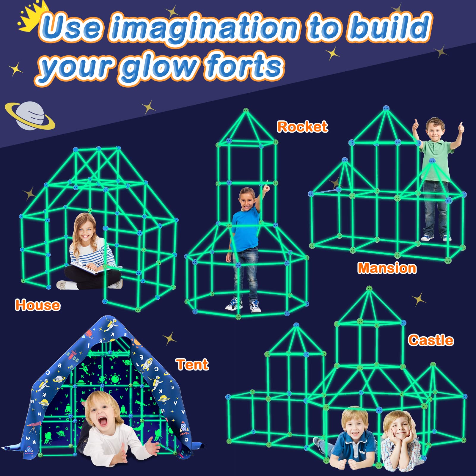 - u3010Fort Building Toy Glow in the Darku3011: Kids fort building kit can absorbs sunlight or indoor lights and emit a green fluorescent effect in a dark environment. Just add a blanket to the fort, and you can create a luminous fantasy world for your child, kids can immerse in it for hours. Kids fort building set is a good place for kids to play and sleep! (Before activating in the dark,the luminous part needs to be exposed to natural light for about 10 minutes).
