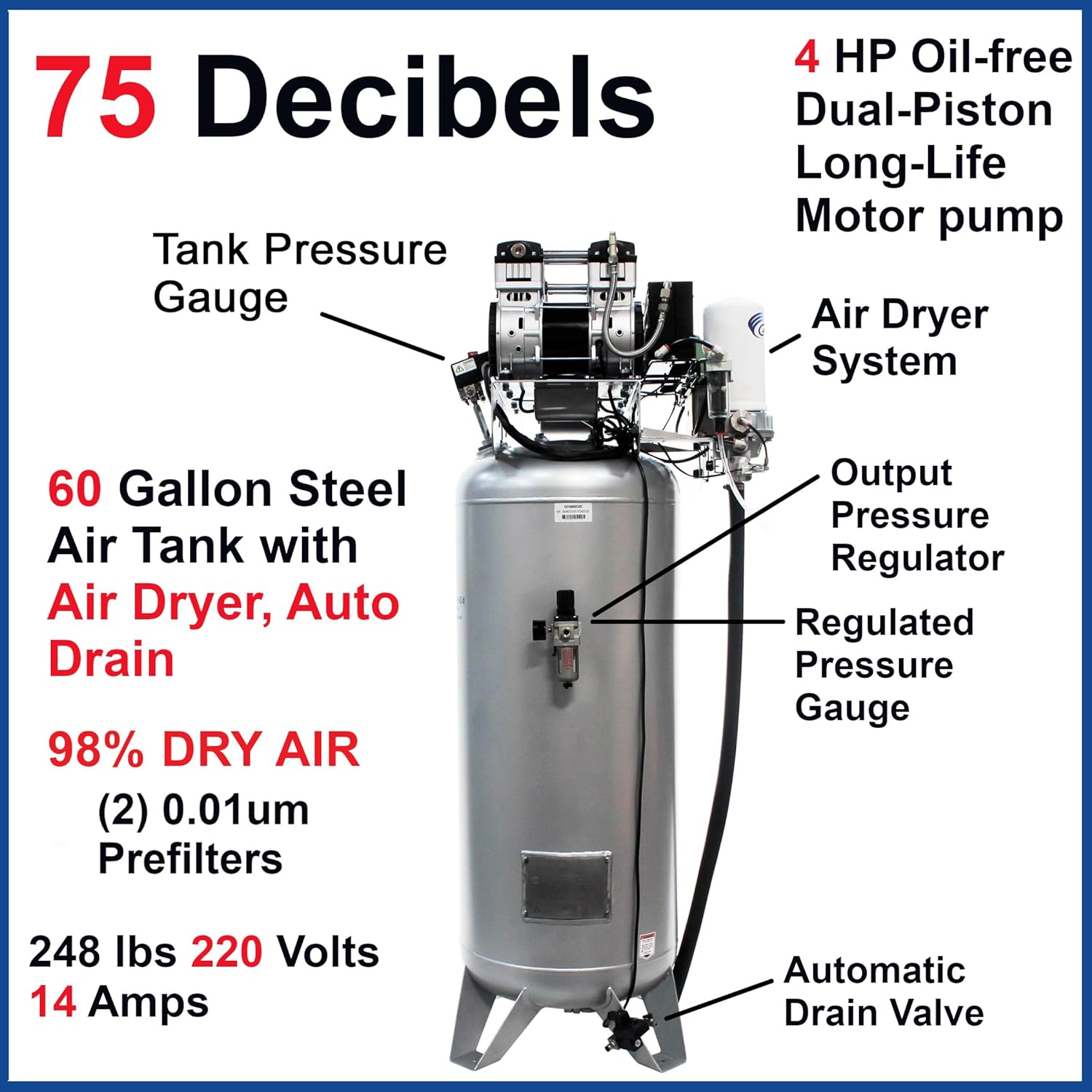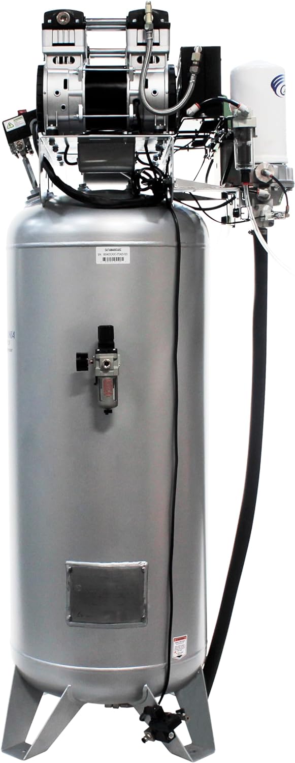 The California Air Tools 60040DCADC Ultra Quiet, Ultra dry oil-free air compressor with air drying system is designed to be 1 of the quietest 4.0 HP air compressors in the industry having only 75 db of sound. The powerful two 2.0 HP motors operates at only 1680 RPM creating less noise and less wear. The cat-60040dcadc air compressor has a oil-free dual Piston Pump designed to have a life cycle before wear of 3000 plus hours compared to other comparable air compressors with life cycles of 1500-hours or less. The large 60 GAL. Steel Air tank is just the right size for shop or garage. The air Dryer is specially designed to remove up to 98% of the water vapor from the air to protect sensitive tools and machinery. Pdp performance range (-20°f to -51°f). air quality: ISO 8573-class 2.3.1. To dry The air from the air compressor an aftercooler and dryer are utilized. The aftercooler is a heat exchanger for cooling the discharge air from the air compressor. The water vapor from the compressed air is condensed into liquid form and pushed into the air Dryer. The easy to replace spin-on air Dryer cartridge has a regenerating high-temperature molecular sieve desiccant to dry The air. This cartridge Dryer has a life of 2-years before replacement. The California Air Tools EZ-1 automatic drain valve Has been designed to eliminate manually draining your air compressor air tank. Designed for the person looking for power, Dry air and air flow with at least 30% less noise. Includes two (2) 0.01 Micron Prefilters. This Ultra Quiet & Oil-Free Air Compressor with built-in Air Drying System is designed for industries including Dental Office, Dental Milling, Dental Lab, Medical, Biotech, Laser, Restaurant, Manufacturing, CNC, 3D Printing and other specialized pneumatic systems with a need for Clean Dry Air.