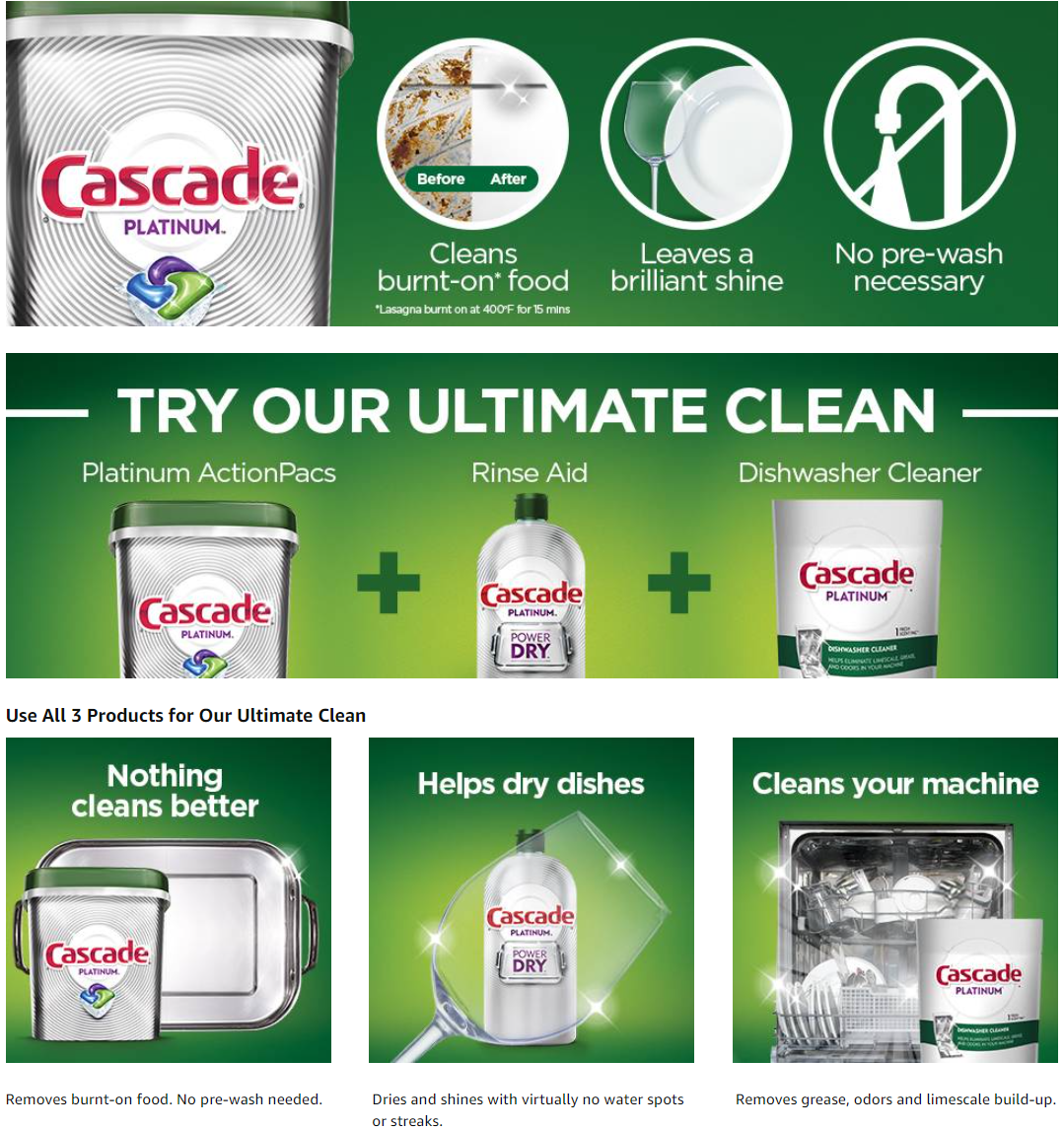 - Cascade Platinum ActionPacs dishwasher detergent cleans burnt-on messes in just one wash, with no pre-wash needed.