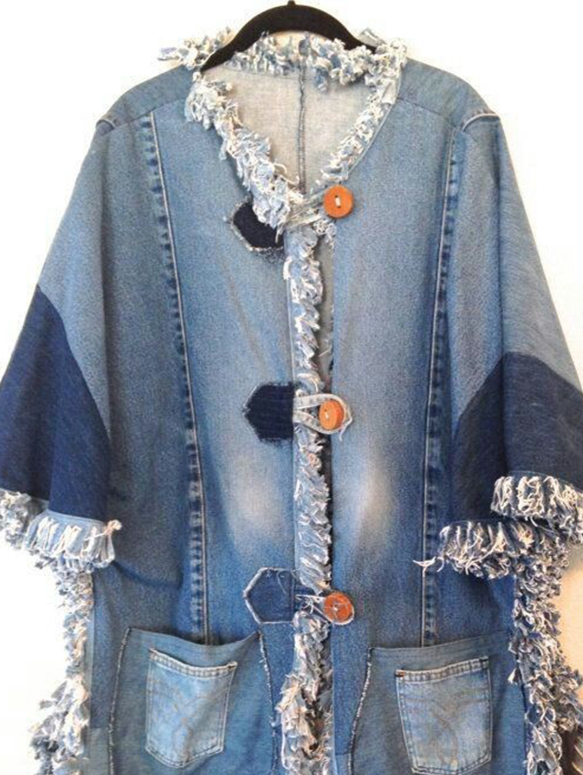 Details: Patchwork, Raw Edge, Pocket, Button, Flare Sleeve