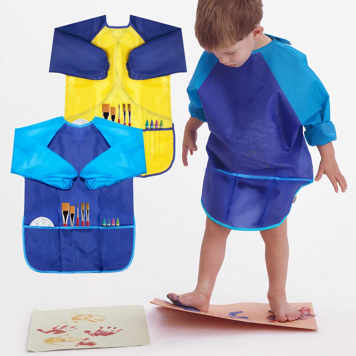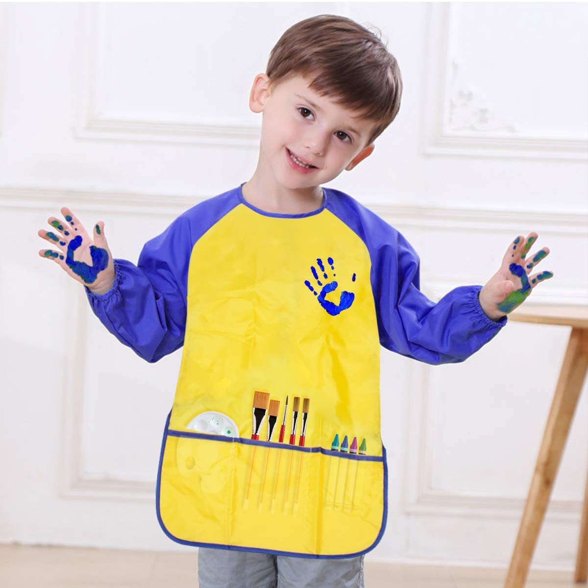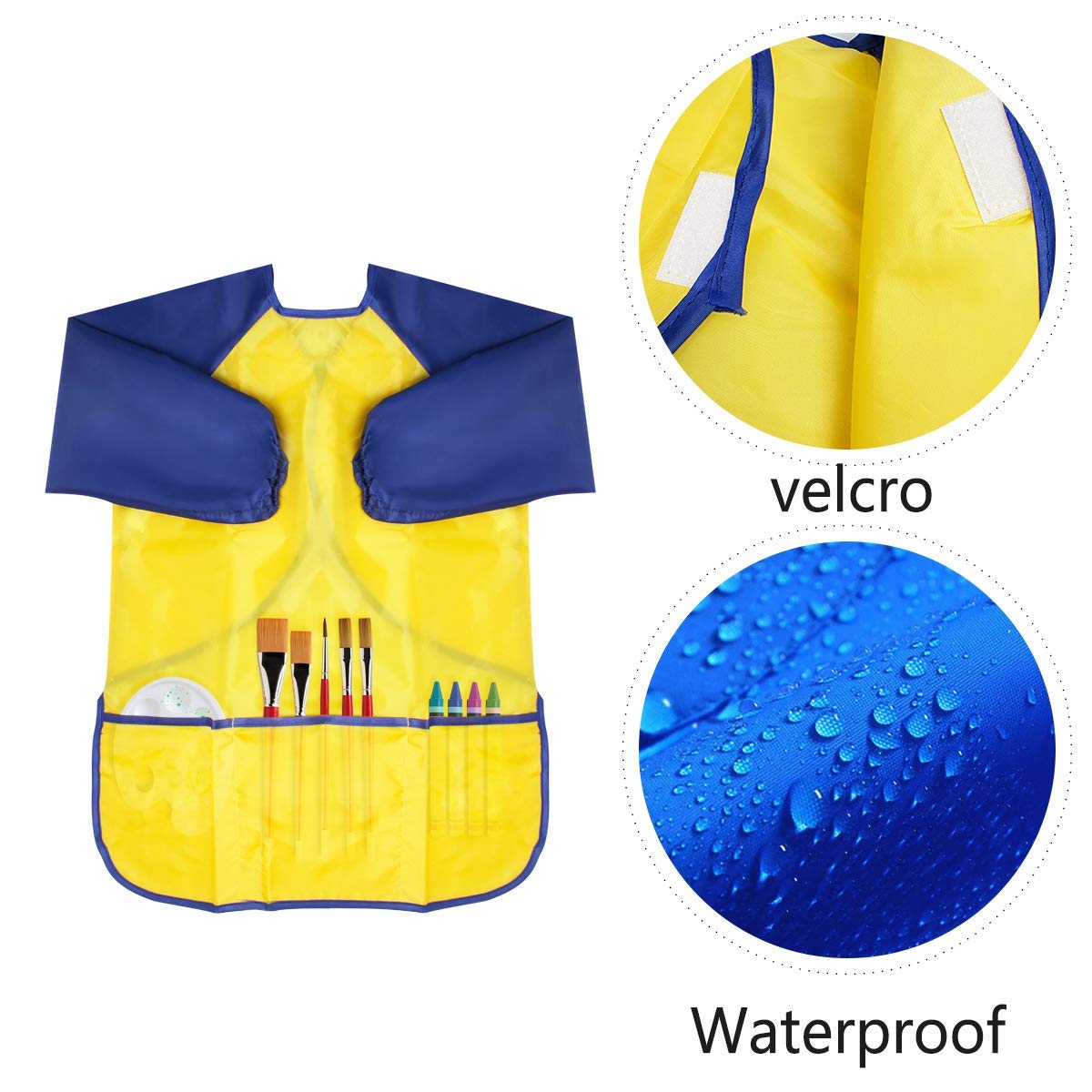 - EFFECTIVE PROTECTION DESIGN - Popular design has long sleeves for best protection and the adjustable velcro closure design for convenient use. Besides, the 3 front pockets helps children to hold water pen, paint, snacks and paper towels and other items.