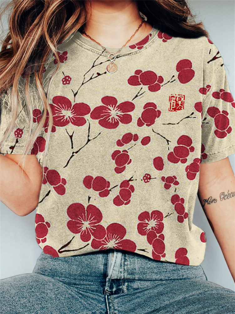 • Cherry Blossom Japanese Lino Art Vintage T Shirt
