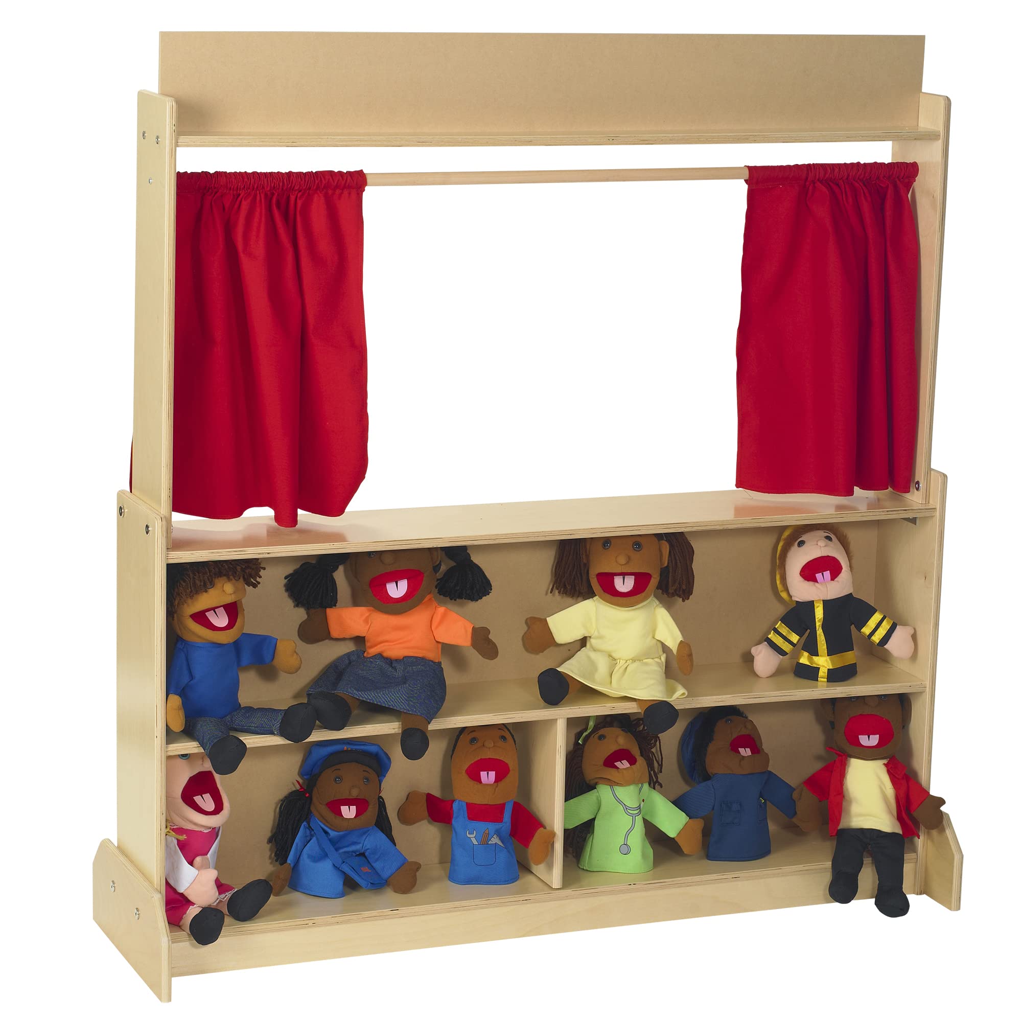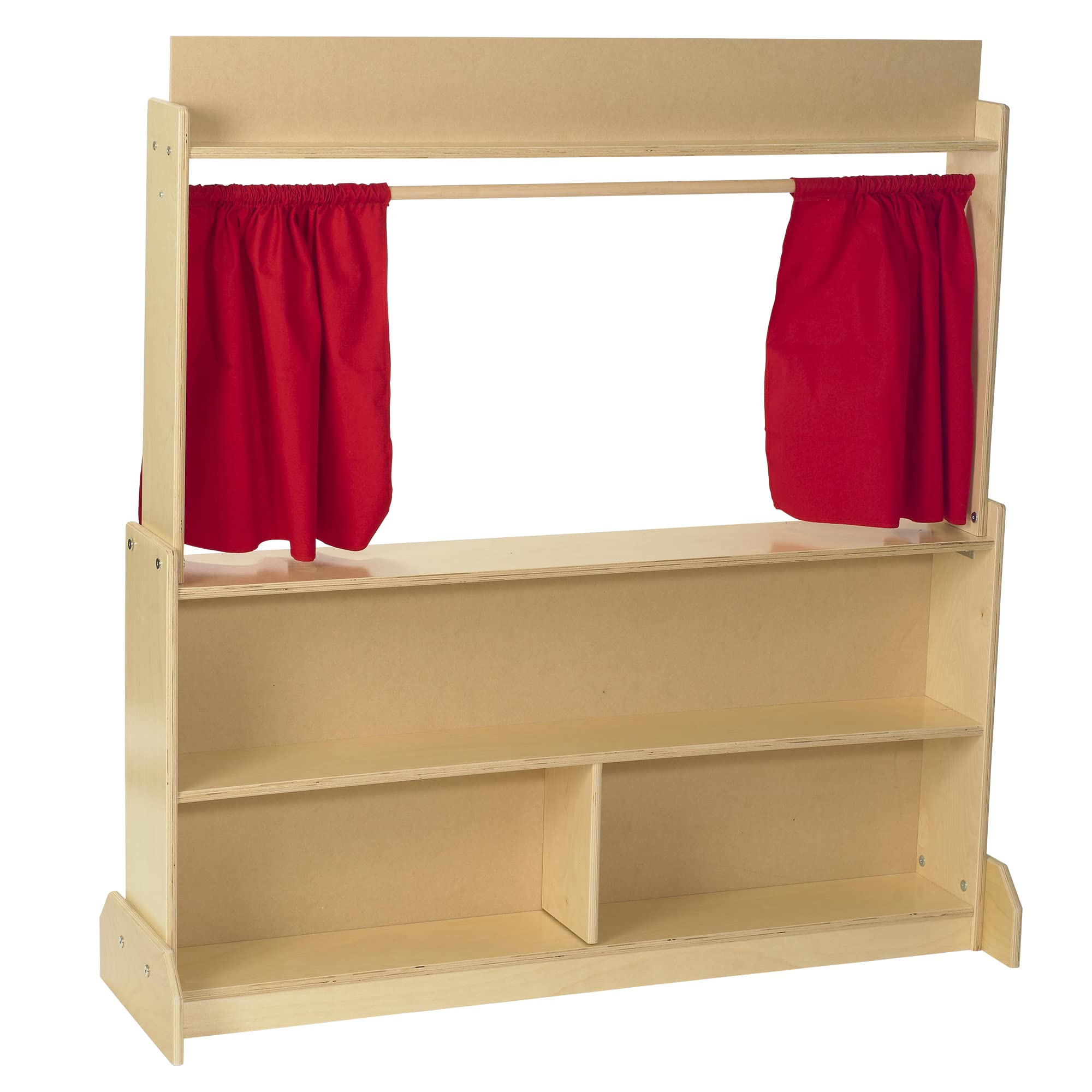 - STORAGE: Pretend play can get messy. Every space needs furniture with storage. This Puppet Show Theatre comes with a sliding curtain and plenty of storage shelves on the back side. Storage areas measure 47"L x 10"H and 23"L x 10"H.