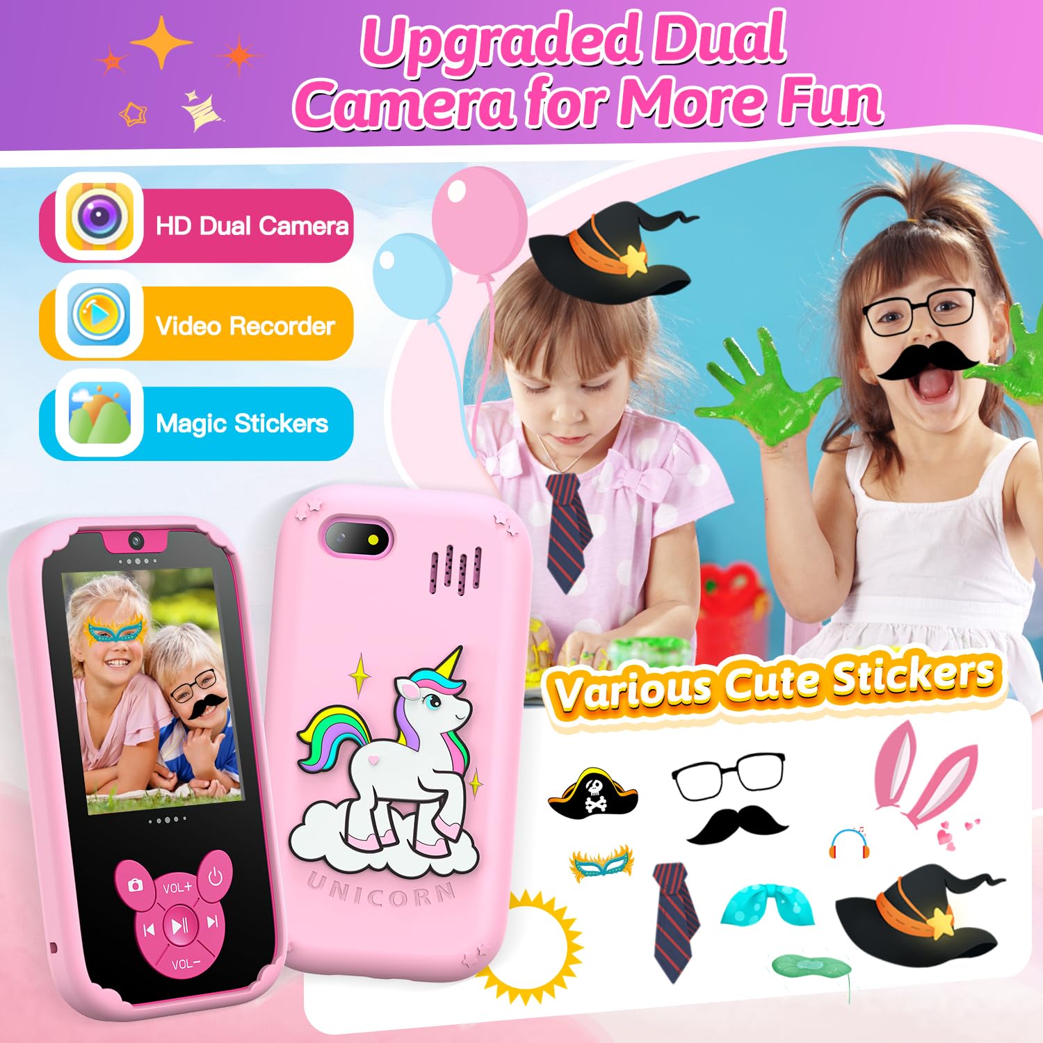 - u3010Dual Camera and Cute Durable Shockproof Designu3011Kids smart phone have dual cameras to take pictures and video recording, kids choose their favorite stickers to take photos and record the beautiful moments and interesting experiences in their lives with family or friends anywhere anytime. The cute unicorn cartoon soft silicone casing provides the kids phone with nti-drop design, allows kids to enjoy happy and freedom photography moments without worries of broken. The toy phone for kids also specially designed a durable lanyard for portability, children can hang the camera on their neck, makes this toy easy to use outdoor.