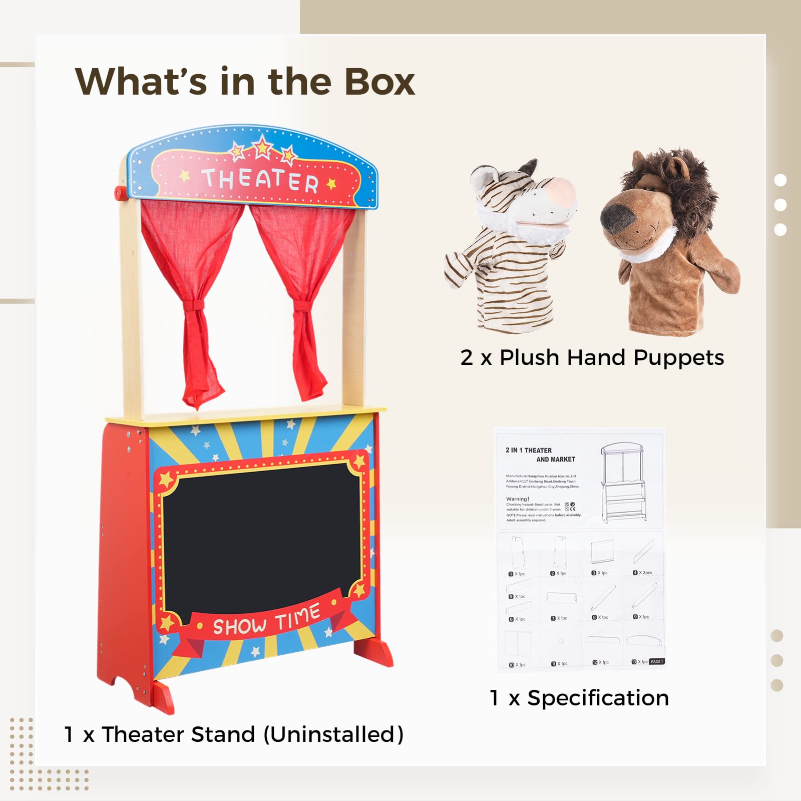 - u3010Puppet Theater Show with Puppetsu3011 On the side of the theater show, the stand features two plush hand puppets, a lion and zebra, two red curtains with lift buttons, as well as a chalkboard for theater information. Kids can play a theater or story with 1 or 2 roles by putting the plush puppets on their hands to act and tell stories like the performance on TV shows.