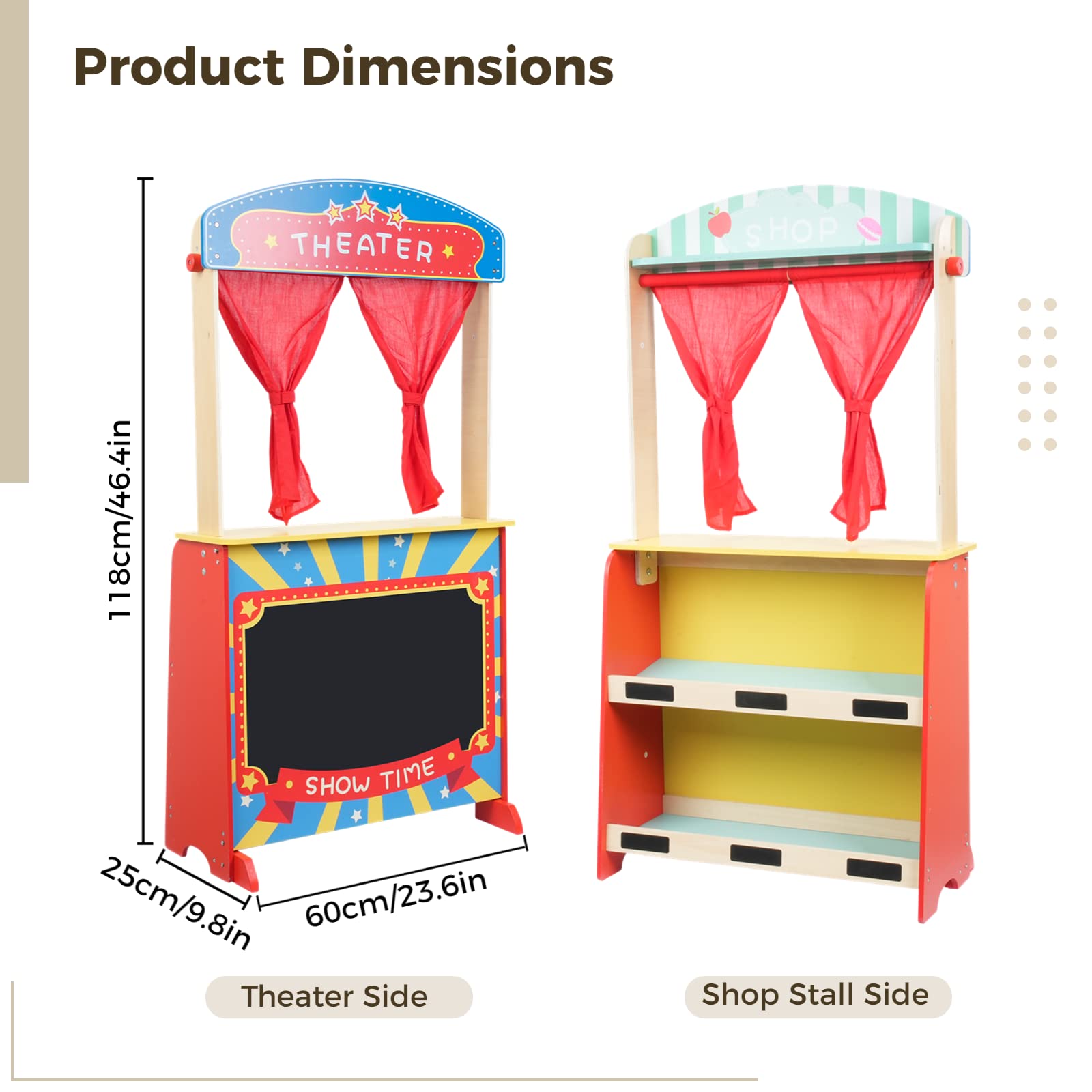- u3010Double-Sided Wooden Standu3011 Made of sturdy heavy-duty wooden boards, this is a multipurpose wooden stand with two functional sides for kids to play house, as one side is for a theater show and the other is for a business stand. Since the solid wood are durable and the painting is safe without toxic substances, it is friendly to the environment and harmless to kids.
