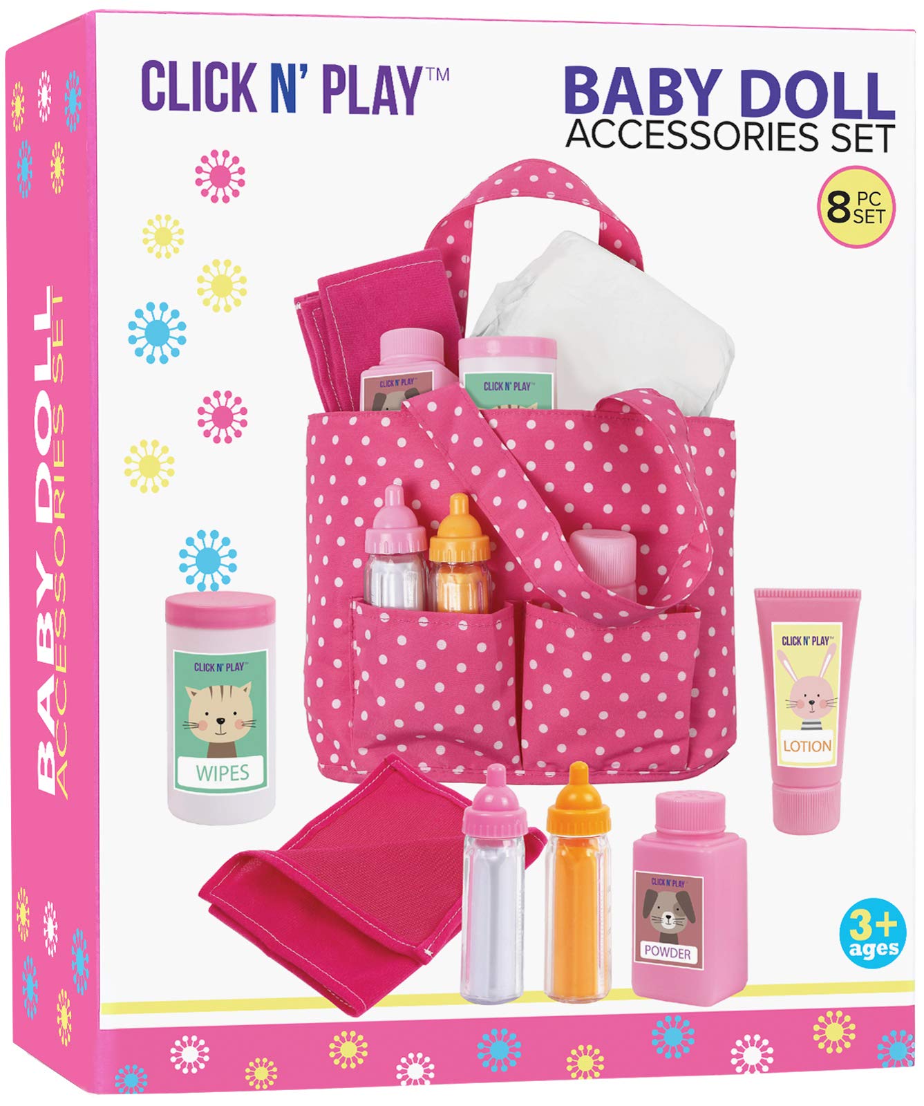 - INCLUSION - This set includes baby pink soft bag, baby doll diapers, milk & juice baby doll bottles, towel, powder, lotion, and wipes.