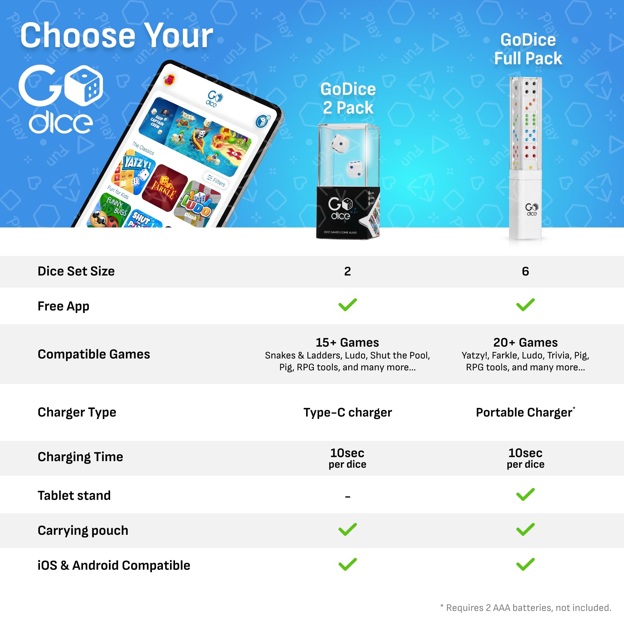 - WHAT IS GoDice Full Pack? - A set of 6 smart connected dice that bring the most popular dice games to the 21st century. Premium quality, and a whole new magical playing experience that turns your tablet or phone to an interactive board game (while using real physical dice)