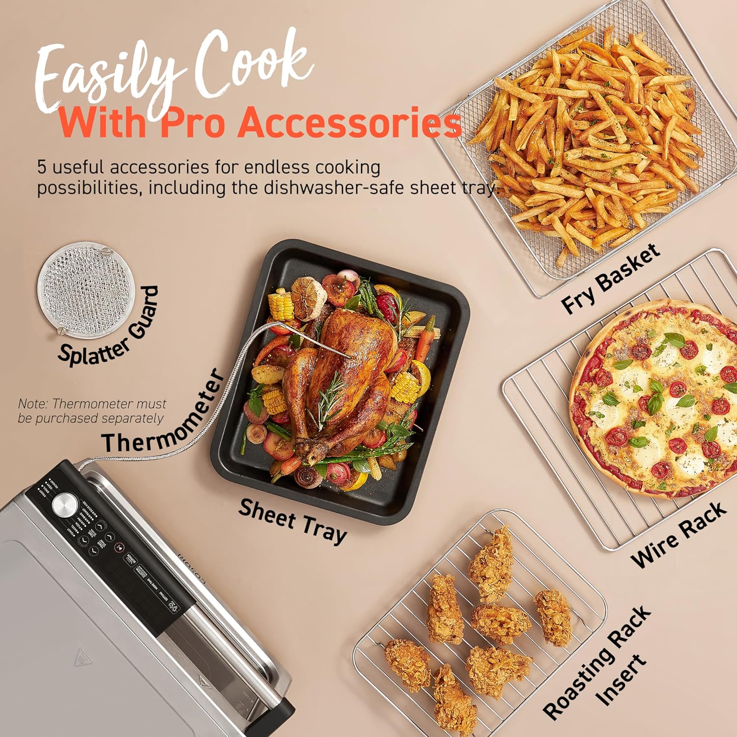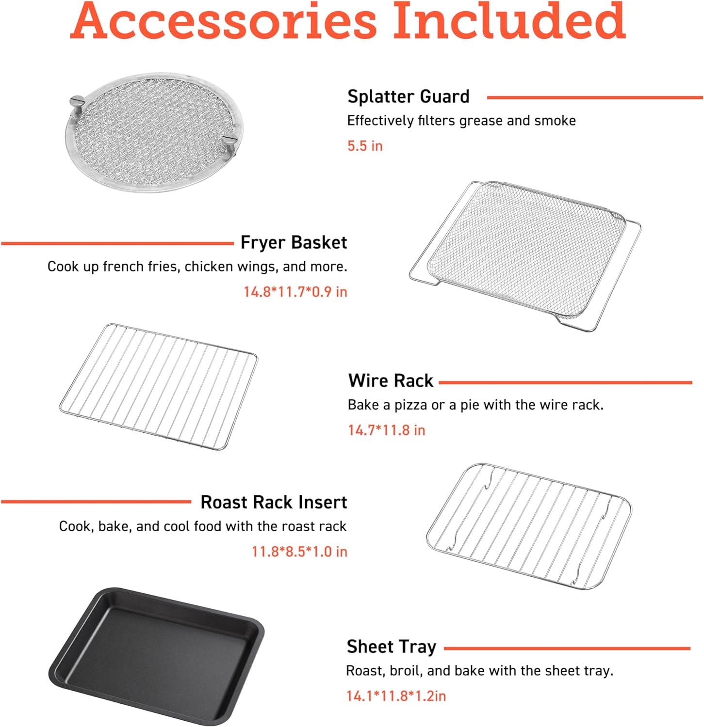 - 5 Included Accessories: Splatter Guard, Wire Rack, Sheet Tray, Roasting Rack Insert, and Fry Basket. Elevate your culinary creativity with convenience.