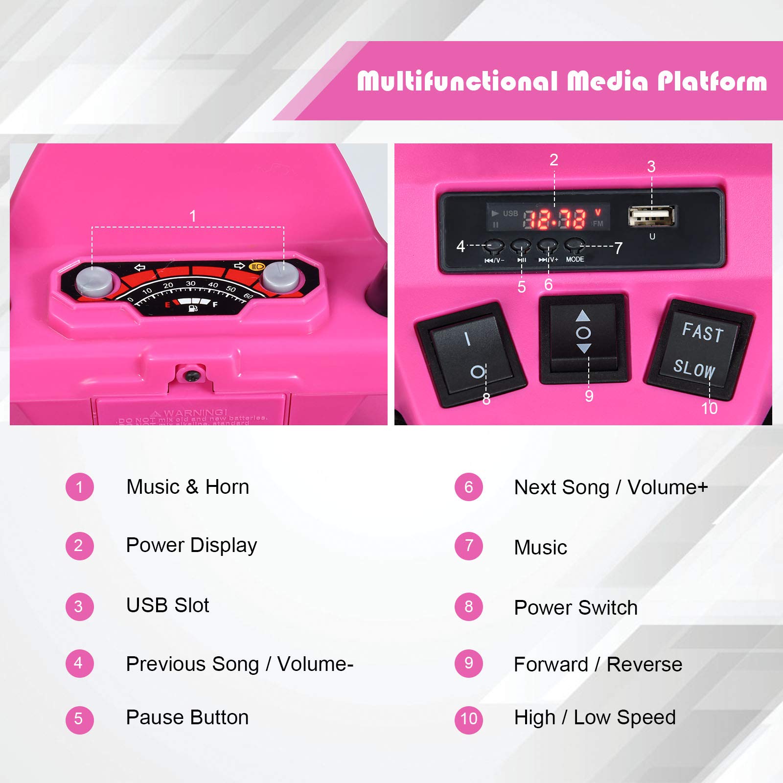 - ud83dude99Cheering Music & Story for Infinite Fun: The battery operated electric ATV of rechargeable design gives your kids the ability to drive for long time after a full charge. Power display reminds you to get it charged in time. And there are several music and stories, designed to cheer up your kids so that they will not feel bored. USB slot function make more resources available further.