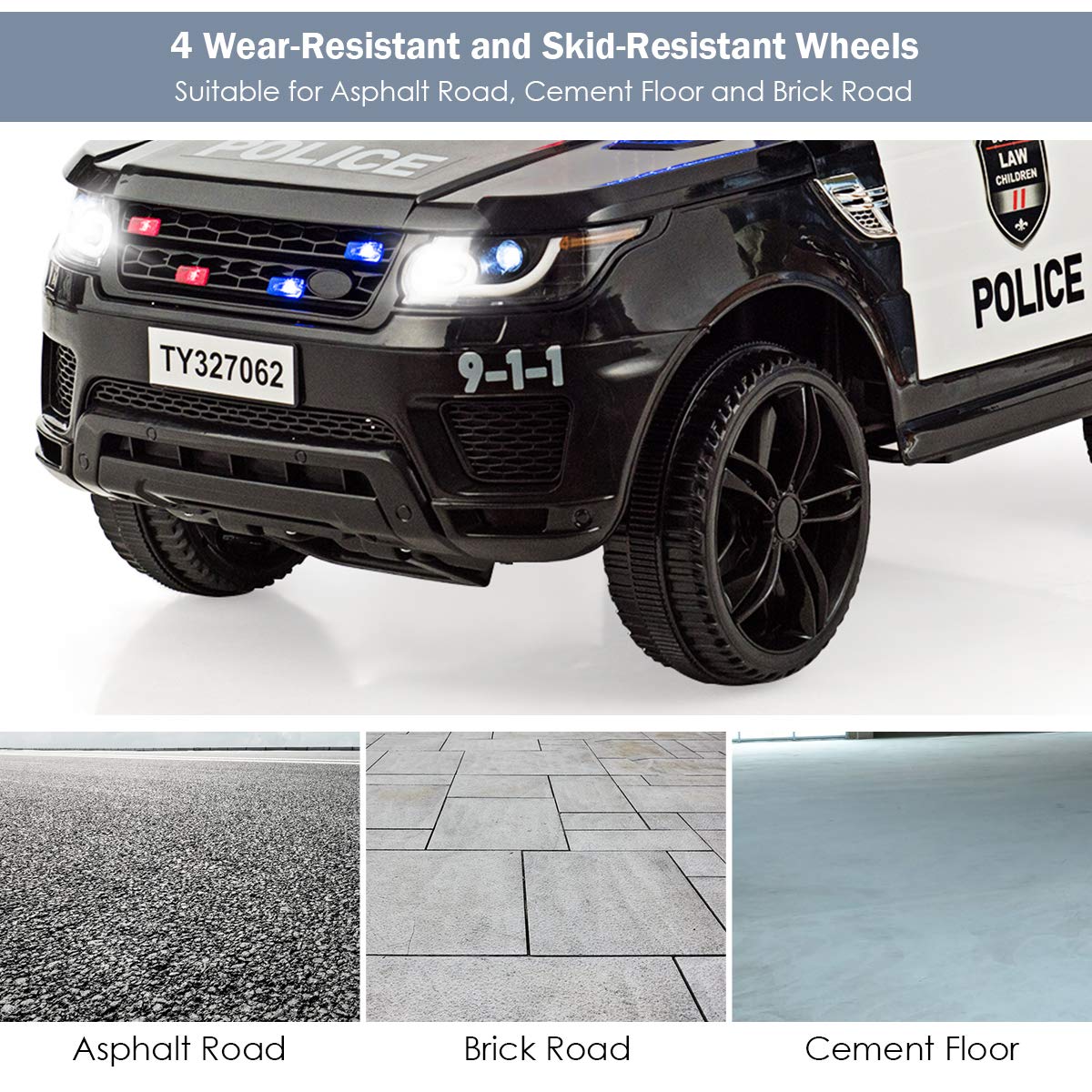 - ud83dudea8Safe & Smooth Driving: With the slow start-up design, our ride on police car can prevent your kids from being scared by excessive acceleration. Furthermore, spacious seat with safety belt and independent suspension system create a stable, smooth and safe driving experience for children. PP materials used in this toy is kids-friendly and harmless for health.