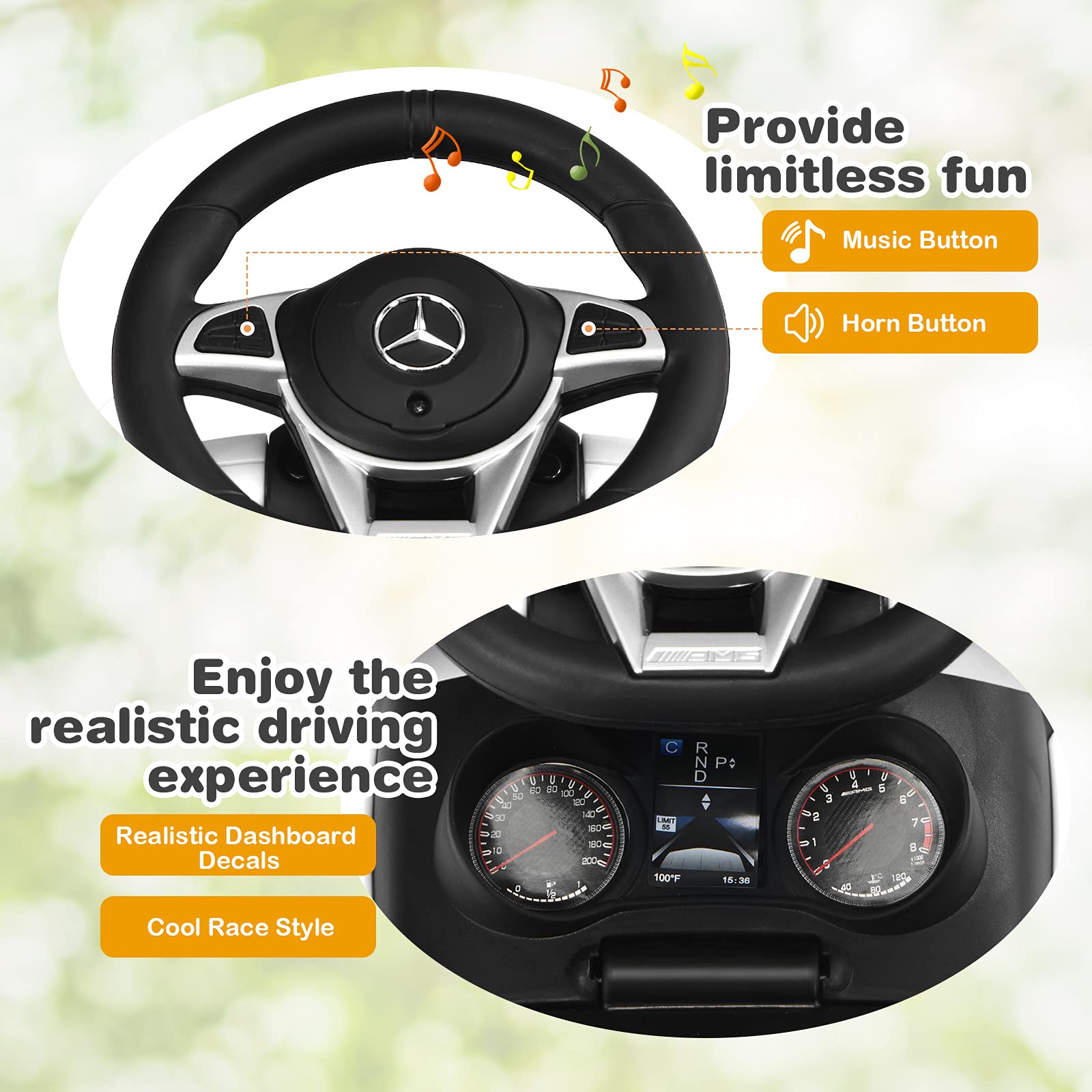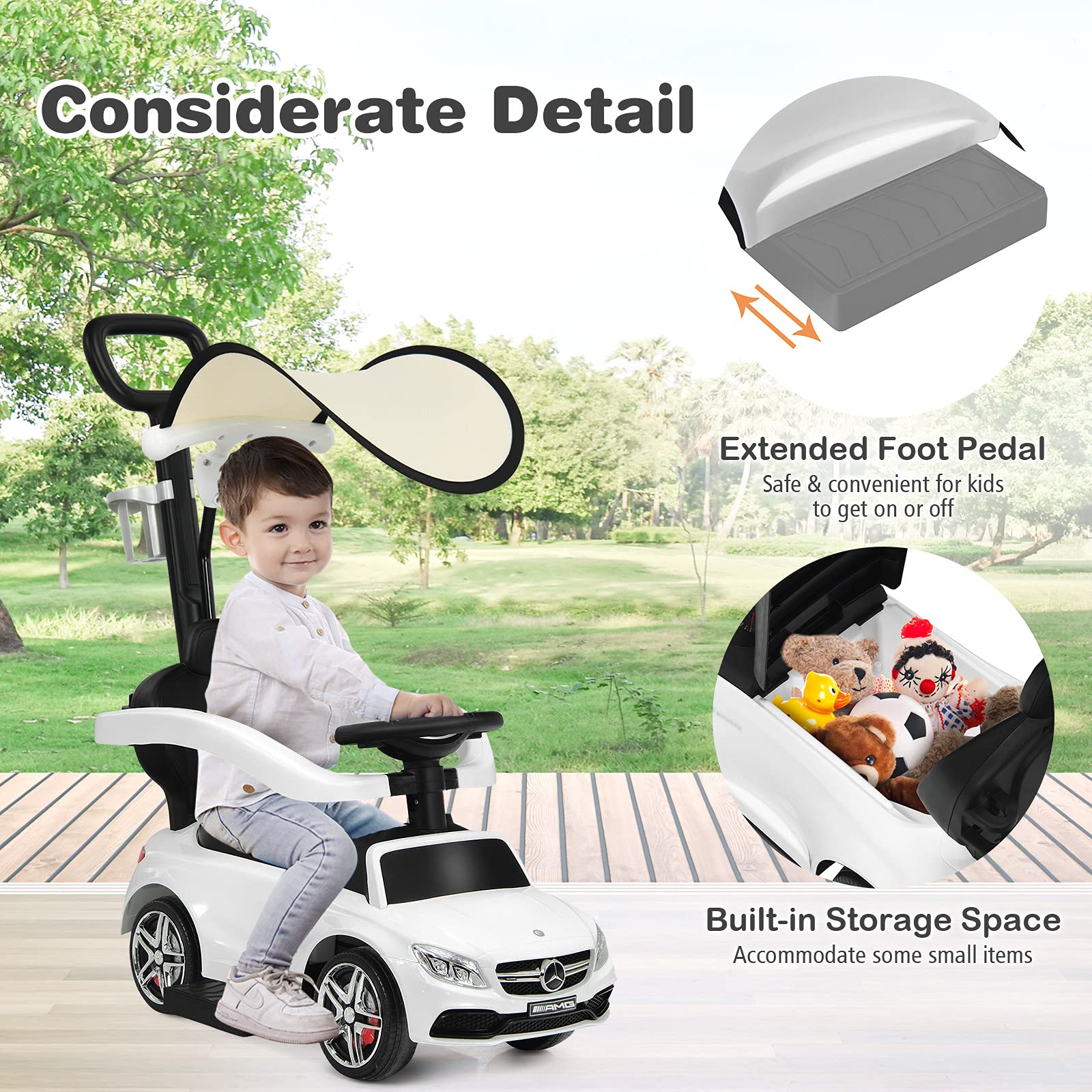 - Cool & Realistic Driving Experience: From the authentic trumpet to the realistic decals, children will cruise in style with this ride on push car. Music and horn buttons on the steering wheel turn driving into a more enjoyable process, bringing limitless fun. In addition, Mercedes Benz licensed style makes it a perfect gift for children for a cherished childhood memory.