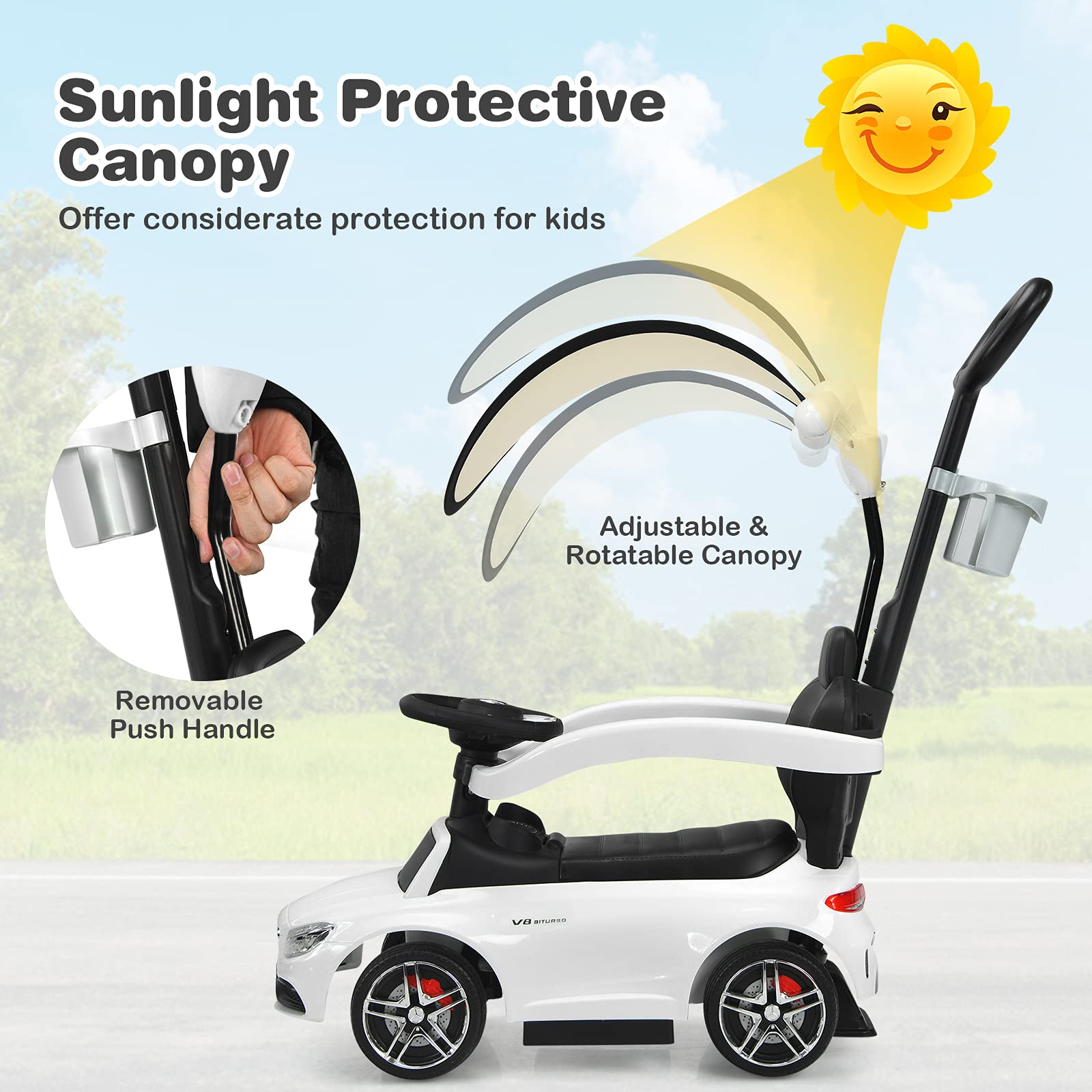 - Adjustable Sun Canopy: Specially designed with a sun canopy, the push car makes it a more comfortable environment for kids. On summer days, the canopy can reflect the sunlight while proving more shadow for coolness. More considerately, the adjustable and rotatable design makes it come with all-round protection for kids.