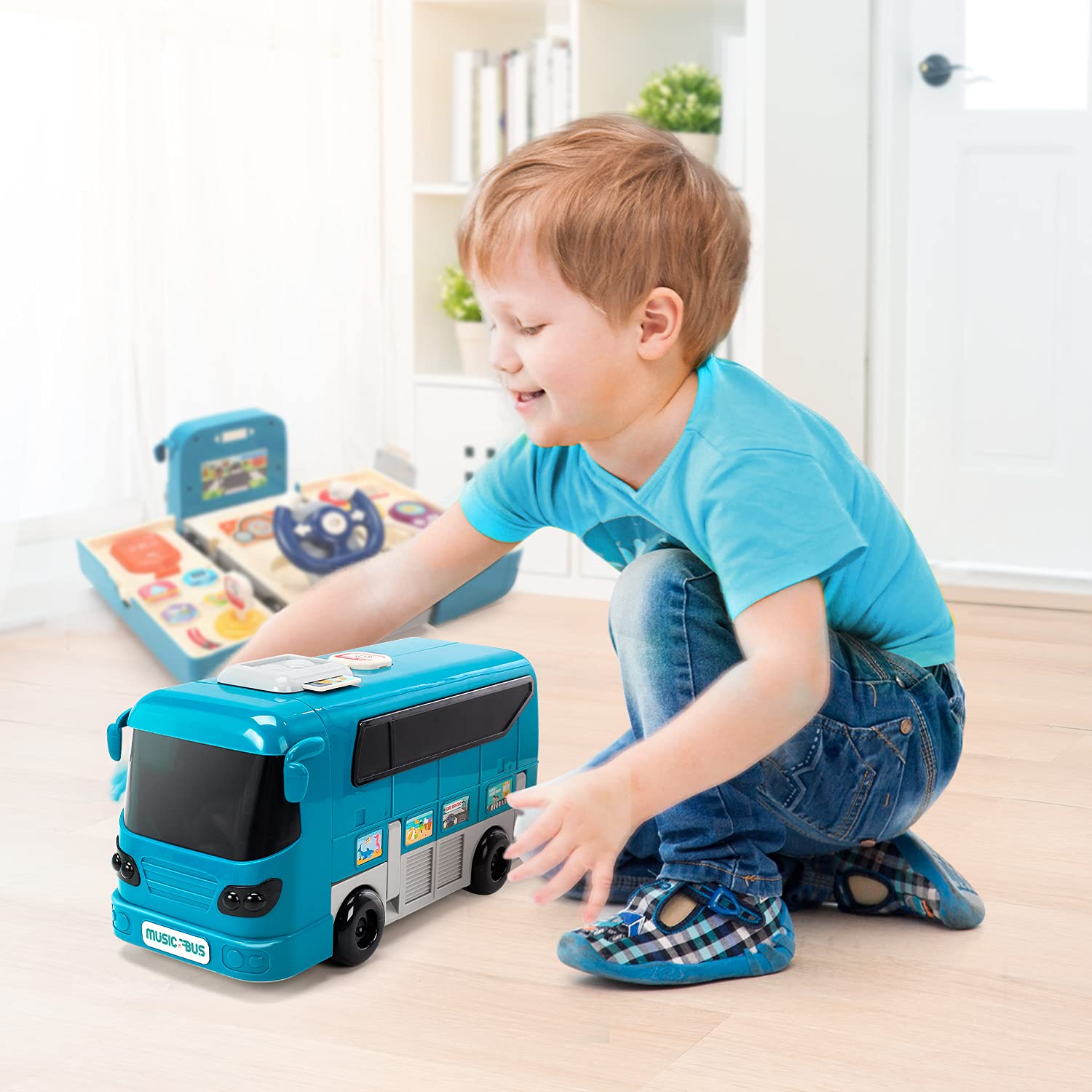 - Multifunctional Bus Car Toy for Toddlers: There are many ways to play with this bus toy. It can be played as a school bus, which can glide a distance with a light push. On the other hand, expand it can be switched to the driving mode and it contains a simulated steering wheel, traffic card, gear shifter, calling machine, etc. All realistic details design allowing children to experience more gameplay.