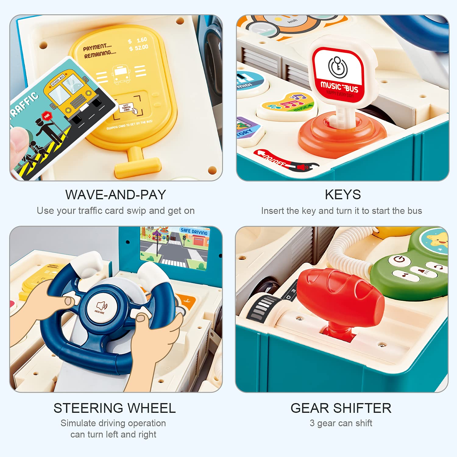 - Simulated Driving: Turn the key to start the engine, and control the steering wheel to turn left or right, honk the horn to remind others, shift the bus, enjoy the accelerated driving and reversing. Kids will love this car toy to pretend he is driving around. A detachable pager will make kids enjoy simulated driver paging dialogue.