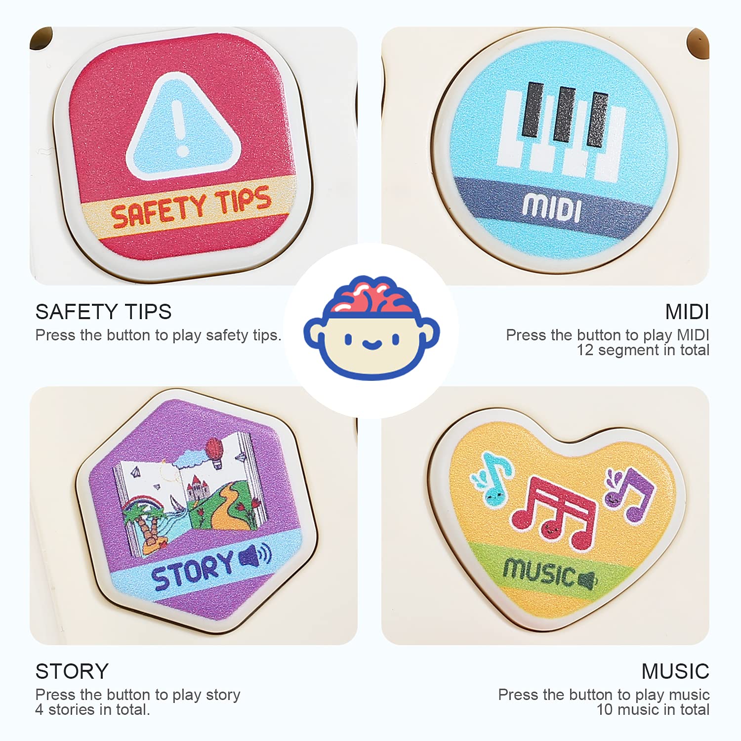 - Interesting Music and light: There are 4 buttons and each button has different content and sound effect. Like pressing the button on the steering wheel, you will see the light and hear the realistic sound of turning or horning. And the bus contains early education knowledge suitable for children so that children can learn with the musical bus. Contains safety tips, story enlightenment, music, and nursery rhymes.