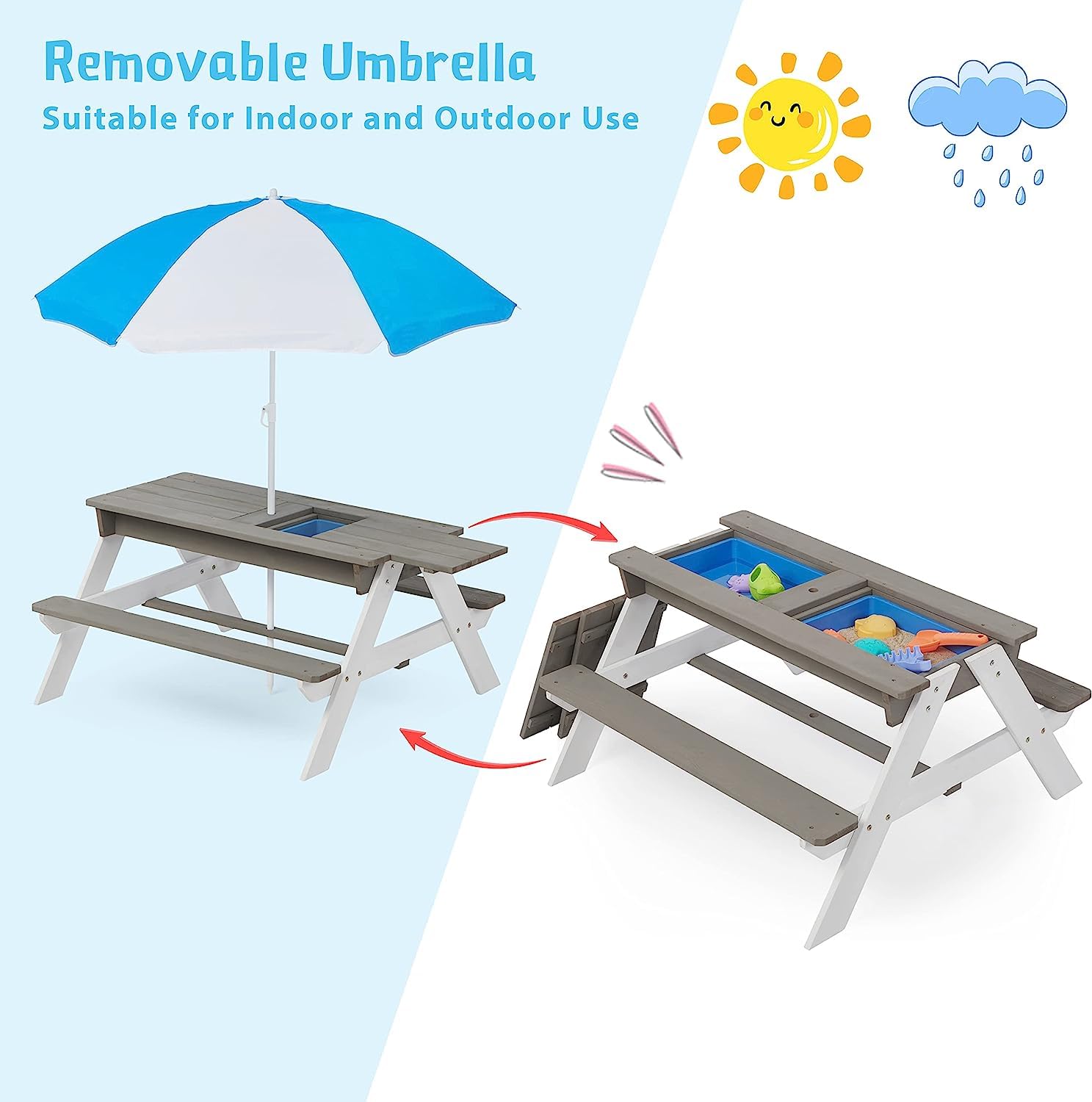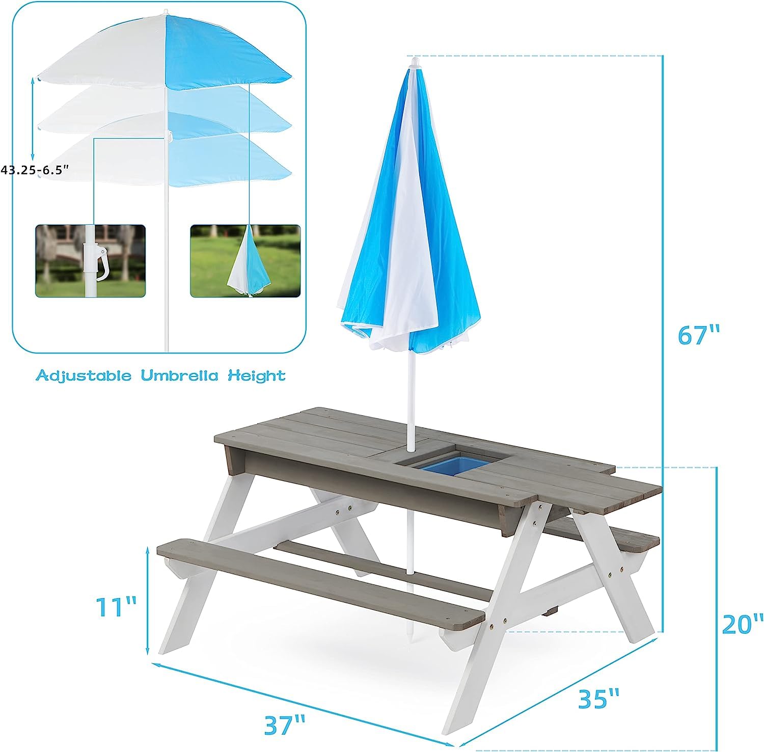 - u3010ADJUSTABLE UBRELLAu3011The umbrella of this Wooden Kid's Picnic Table can be adjusted and protect your kids from the dazzling sunlight. And the umbrella can be removed and folded for space-saving storage.