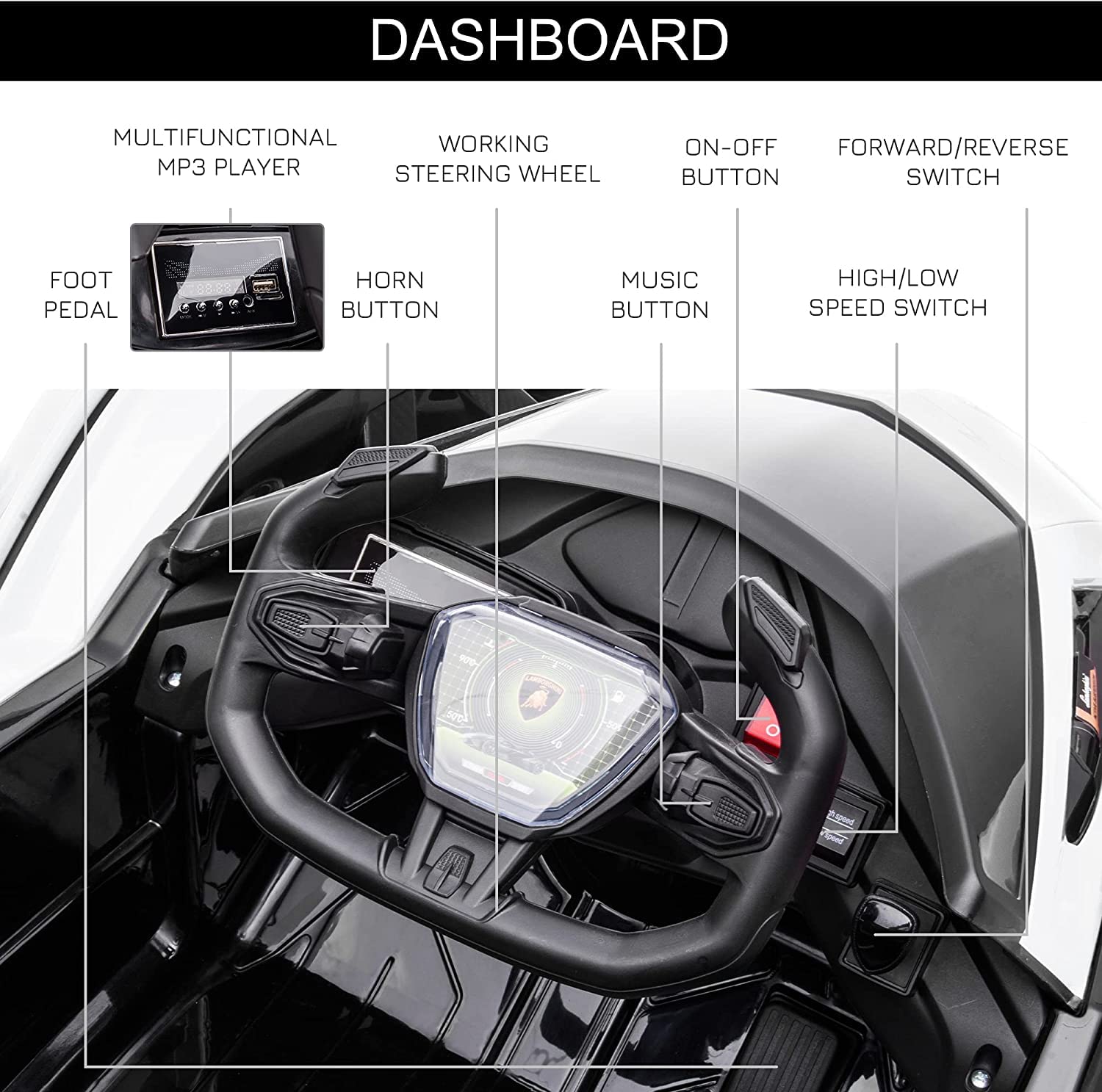 - POWERFUL MOTORS Supported with Lamborghini Suspension system for shock absorption ensures a smooth driving experience on a bumpy road.