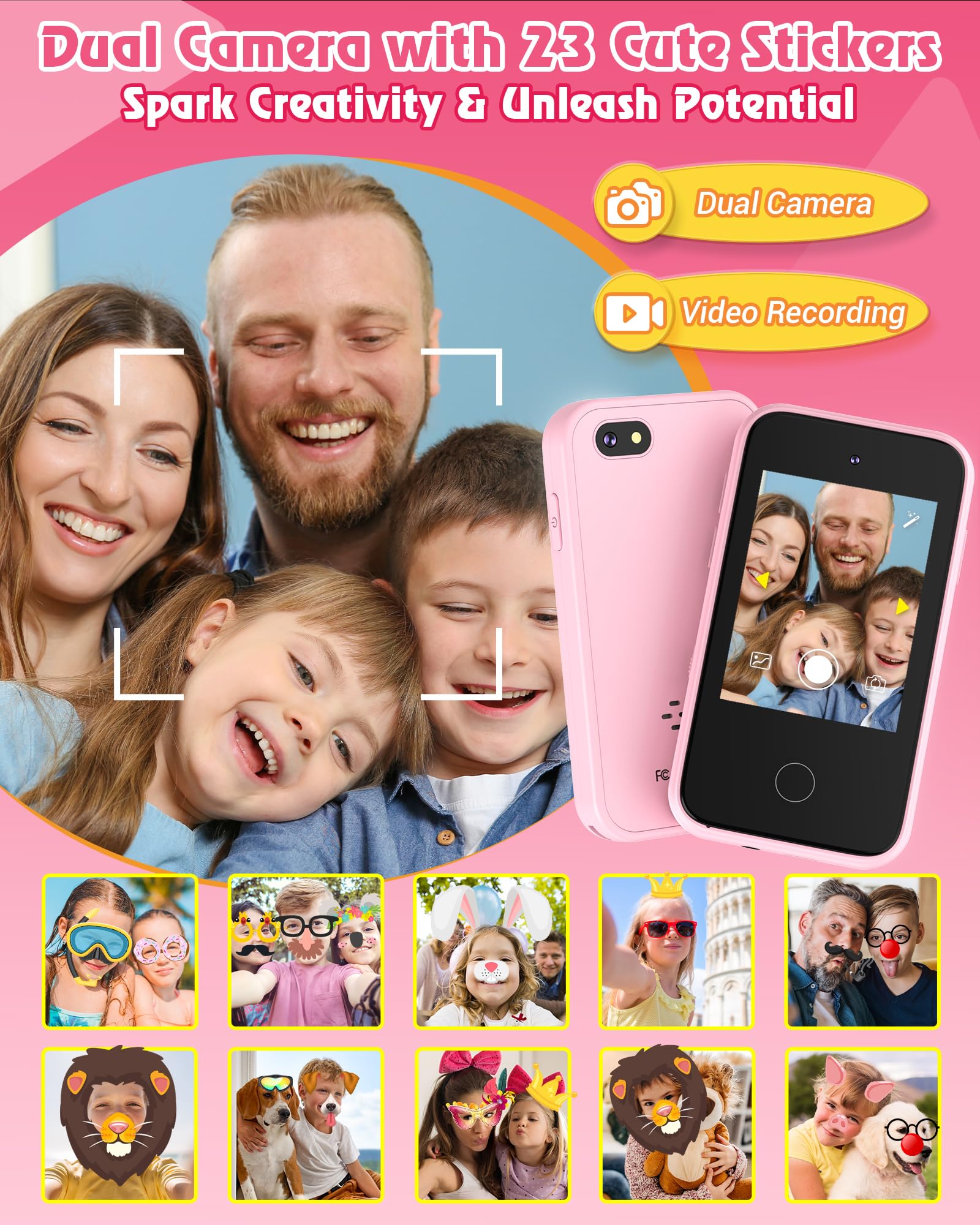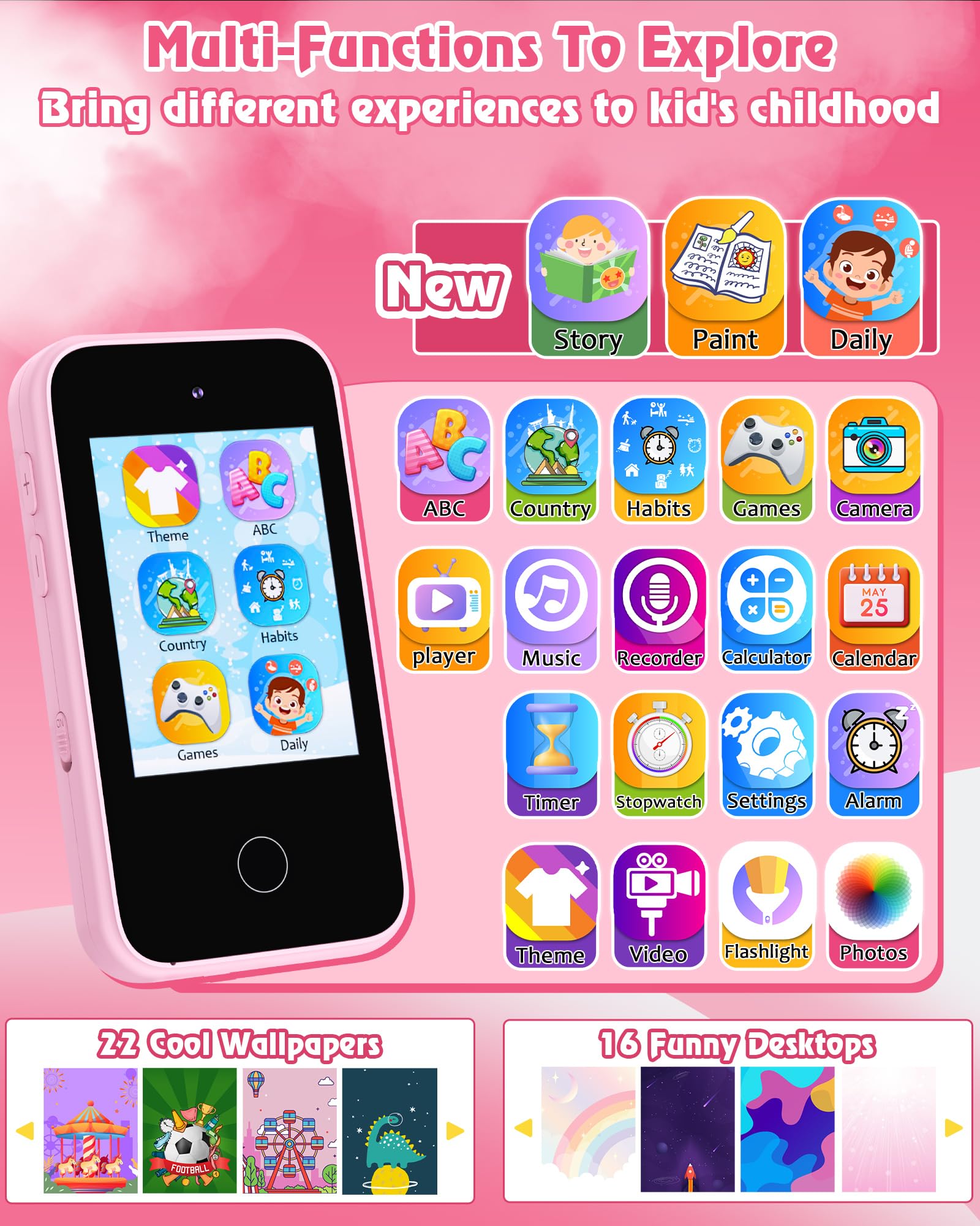 - ud83cudd92 New Generation Smart Phone for Kids: Another way to explore the infinite fun of childhood! with 2.8" touchscreen, auto Focus, 8.0 Megapixels, What's more, adopt 360 fall-resist protection technology, with no fear of scratches and drops. 24 wallpapers & 10 choices of desktops, kids can freely definite their own style, besides, ABC learning, calculator, calendar, torch, stopwatch etc, waiting to be explored.