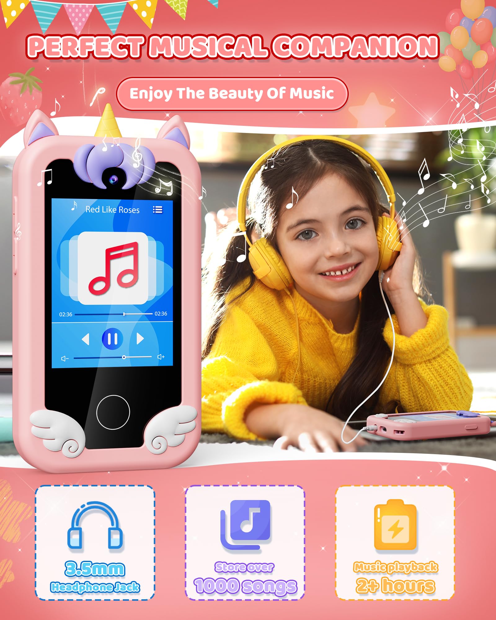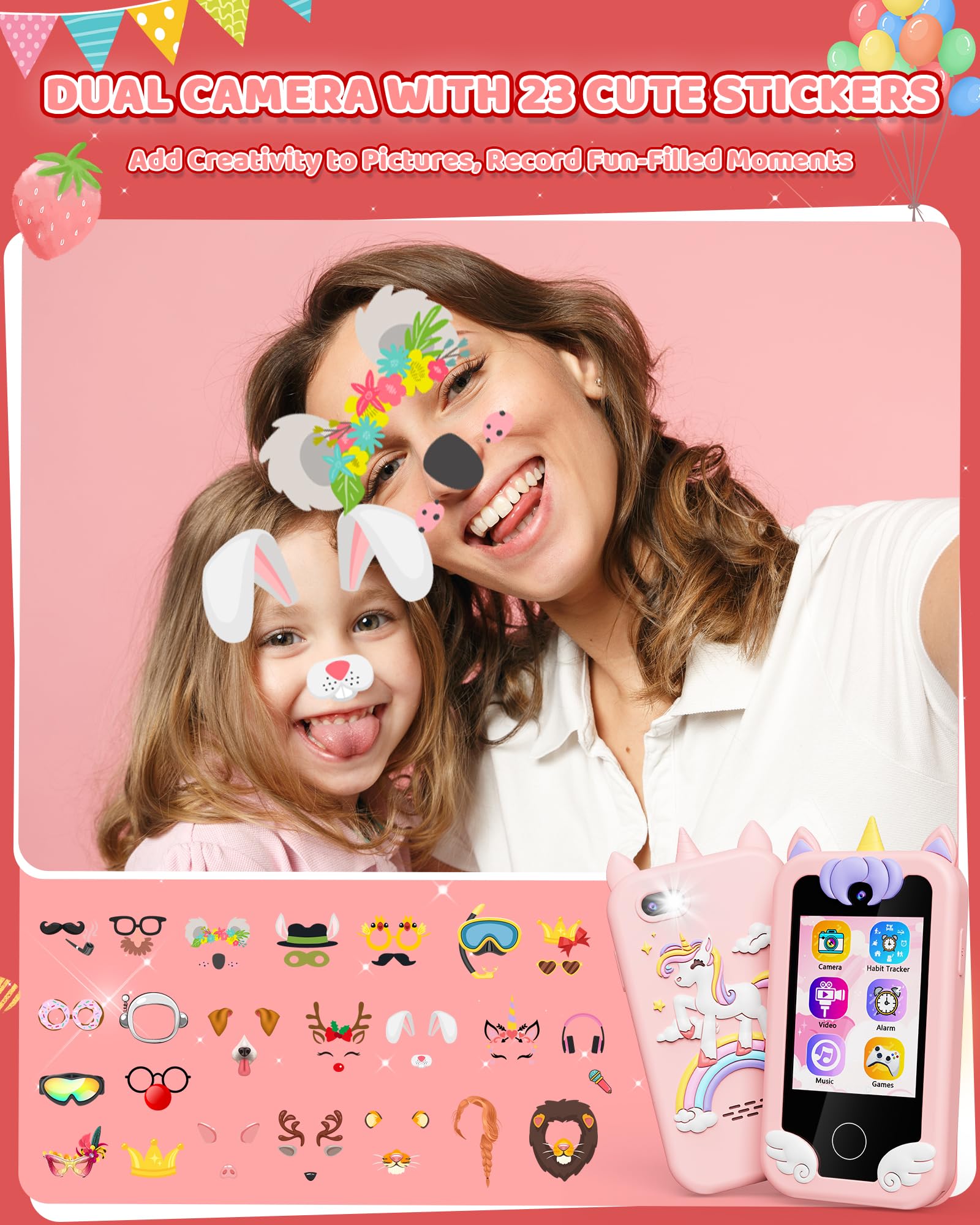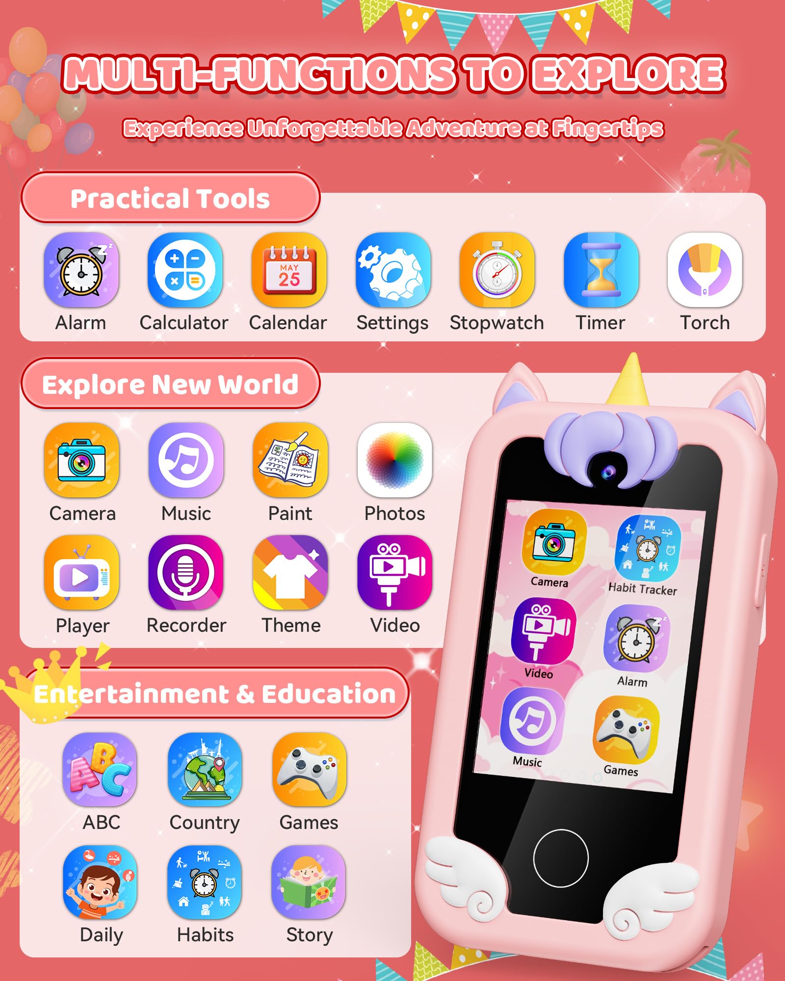 - Upgraded Fall Protection Kids Toy Phone: Another way to explore the infinite fun of childhood! with 2.8" IPS touchscreen, Autofocus, 8.0 Megapixels dual camera, kids can easily take pictures and videos, enjoy music and play games. What's more, this pretend phone toy can also use as a torch, alarm, calculator and calendar. with upgraded fall protection, can effectively prevent phone from damage of impact, Provides strong protection when falling from high place such as desk, dining table.