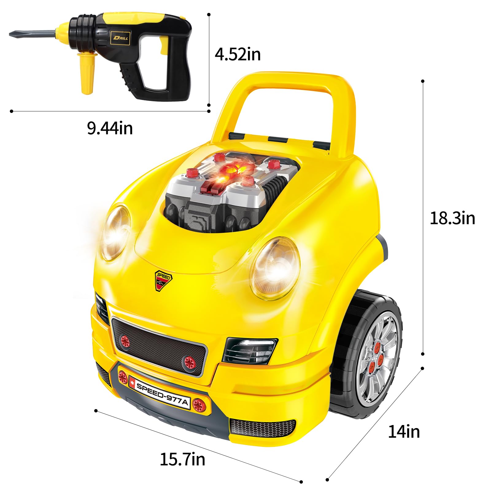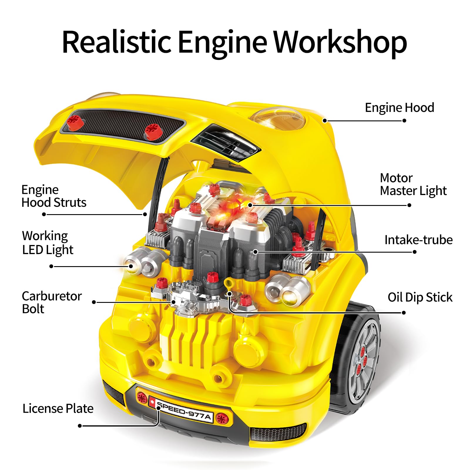 - u3010Realistic car engineu3011Made of high quality ABS material, simulate real driving, start the engine, turn on the hazard warning lights, automatic shifter, steering wheel with horn, lift the jack stands, remove the wheels and rims, push and pull the handle of the engine. Storage space is also included.