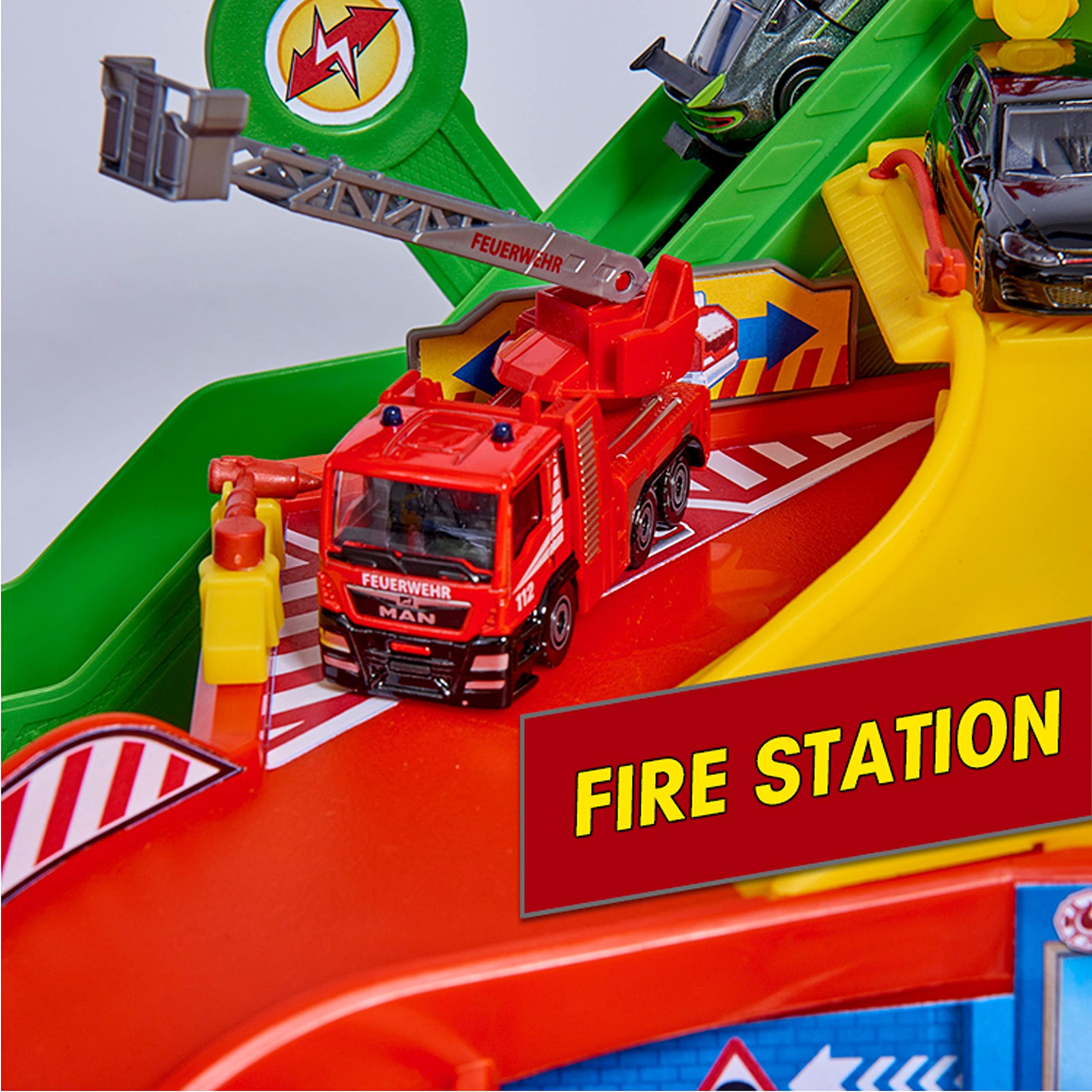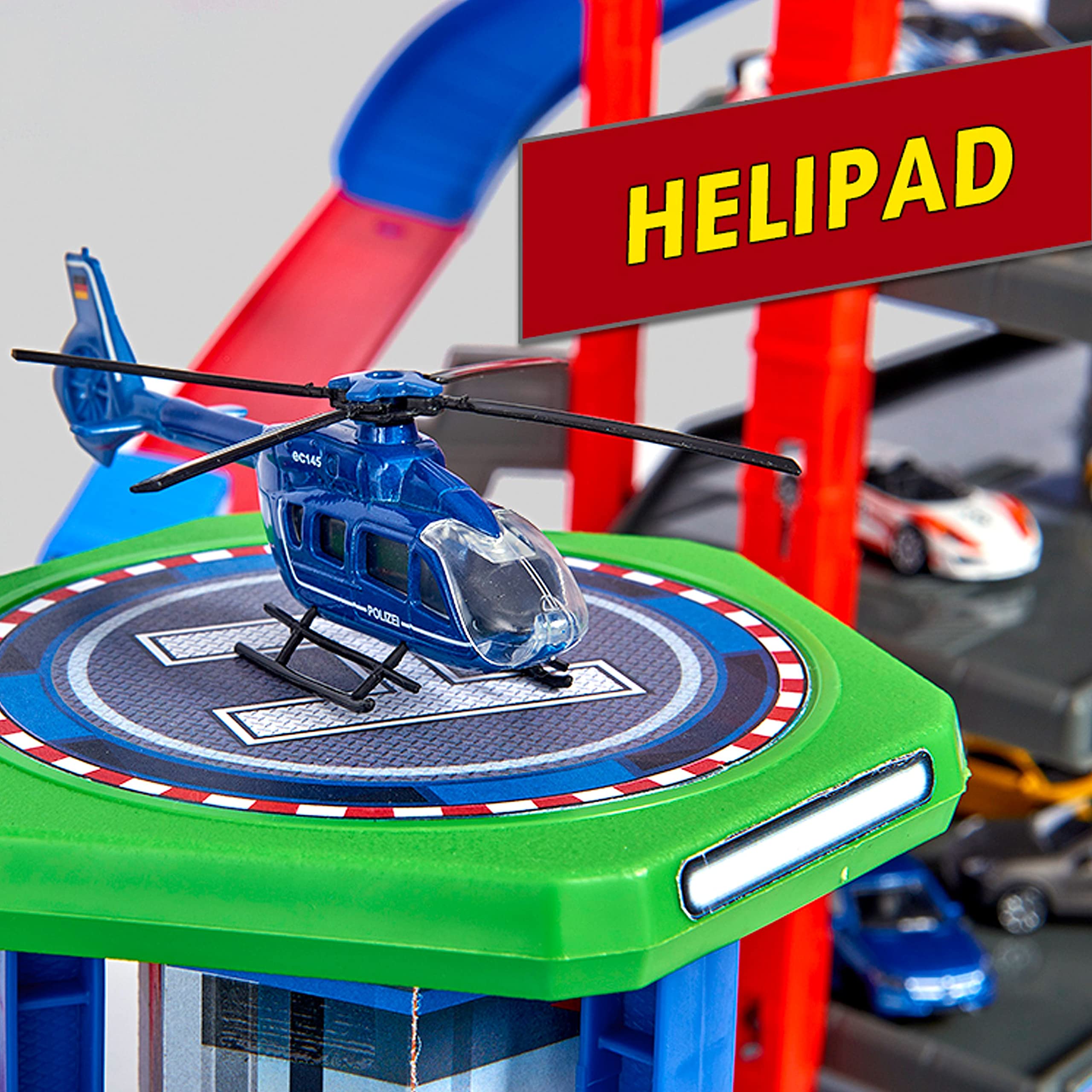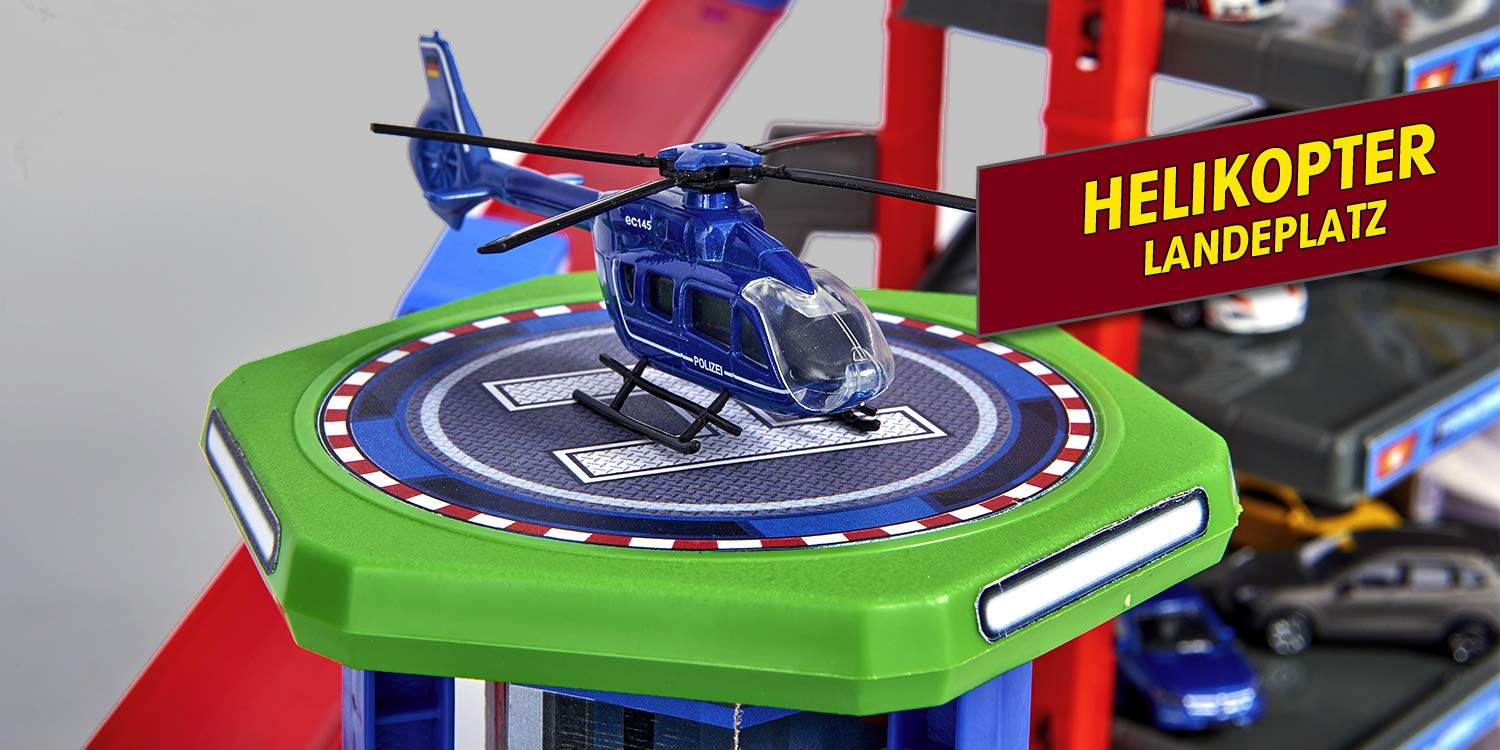 - Includes 6 die-cast toy cars with freewheel function: Audi R8 Coupe, Ford Mustang Police, Ford Mustang GT, Toyota Hilux, Iveco Ambulance, Iveco Fire Brigade