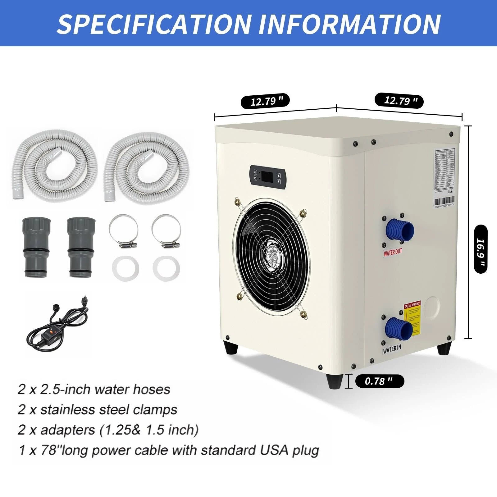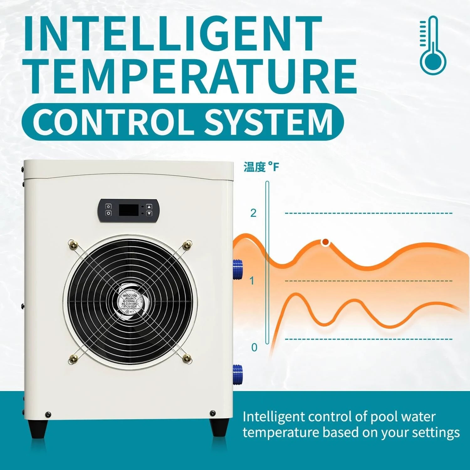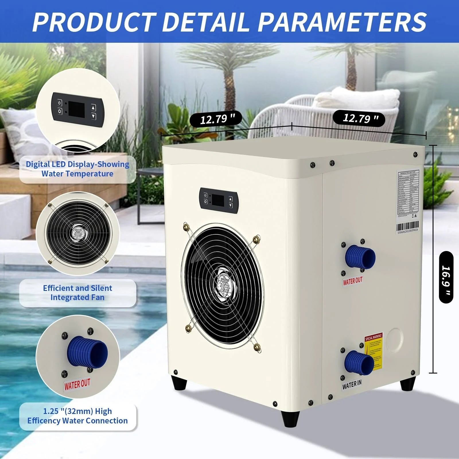 Docred Electric pool heater is suitable for small pools up to 4000 gallons. The pure titanium heat exchanger can resist any corrosion from pool water. An intelligent control system maintains the pool temperature at a consistent level. It is suitable for above-ground swimming pools, hot tubs or spas.A warm pool for your kids, pets and the whole family! Feature: 銆怑lectric Pool Heaters for Above Ground Pools銆慣he mini pool heat pump is specially designed for small pools of up to 4000 gallons. It is suitable for above-ground swimming pools, hot tubs or spas. 銆怌onvenient Assembly銆慖t allows fast and easy hookup without professional installation, just hook up several quick connectors, then plug and play. 銆怑nergy Save銆態ase on heat pump technology, the EU50 heat pump absorbs energy from the air and transfers it into the water. So the operation only requires very limited electric input, hence its high efficiency and heat conversion rate can reach a score of COP 5.6. 銆怉djustable Temperature Control銆慣his above ground pool heater can not only provide heating but also cooling. Allowing you to easily customize the water temperature to your preference. The water temperature is displayed on the LED screen, and the control settings are simple and convenient. 銆怭remium銆慐quipped with a powerful compressor, the pool heat pump has 2 kinds of capacity, A80.6W80.6 14331 BTU/hr and A56 W78.8 8496 BTU/hr.The pure titanium heat exchanger can resist any corrosion from pool water. An intelligent control system maintains the pool temperature at a consistent level. It also adds 4 way valve to help defrosting automatically. Specification: Rated Heating Capacity:14300 BTU/hr Power Input:0.65 kw C.O.P: 5.4 W/W Voltage:110V/1PH/60Hz Rated/Max Current:6.2/8.0Amp Advised water flow:400~530GPH Water connection:1-1/5鈥?Net Dimension:12.8*12.8*17 inch Rated Performance:Perform at Air 68掳F, Humidity 70%, Water Heated to 80掳F Accessories: Built in 10ft power cable with USA standard plug 2 x 2.5-inch water hoses 2 x stainless steel clamps 2 x adapters (1.25 & 1.5 inch) Notes: You need to confirm your water pump, and the advised water flow of our mini heat pump is 400~530GPH. If the water pump flow is too large and the water circulation is too fast, the heat pump will not have enough time to heat the water. When the pump works properly, there is a temperature difference between the fan outlet and the back air inlet, and also a temperature difference between the water inlet and the outlet It is recommended to use an ordinary swimming pool cover or a solar swimming pool cover for heat preservation If you want your pool's temperature to rise quickly. Must be operated with 110V/60HZ US voltage, and the water pump and heat pump must be running at the same time. Please allow the machine enough place to dissipate heat and avoid blocking. If the machine is not heated, first check the fault code or panel display on the control panel. If the machine is found to be frosted and frozen, check the air humidity and ambient temperature. The defrosting condition of the machine is that the machine should be powered on continuously for 45 minutes, the surrounding temperature is within 68oF, and the air humidity is within 70%. Automatic defrosting is possible under this condition. The recommended swimming pool capacity of the machine is below 2700GAL. If you want to heat a 4000-5000GAL swimming pool, it is recommended to use 2 such machines in series.