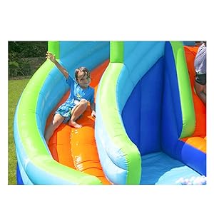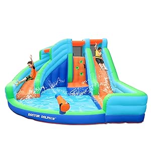 - [ Easily install & Safety ] : It only takes a few minutes to inflate the Water Slide and easy to pack after using. Wipe water off the fabric or allow to dry in the sun before storing.Preparation area surrounded by reinforced net sidewalls that to provide children a safe area, keeping safe to slide in pareparing.