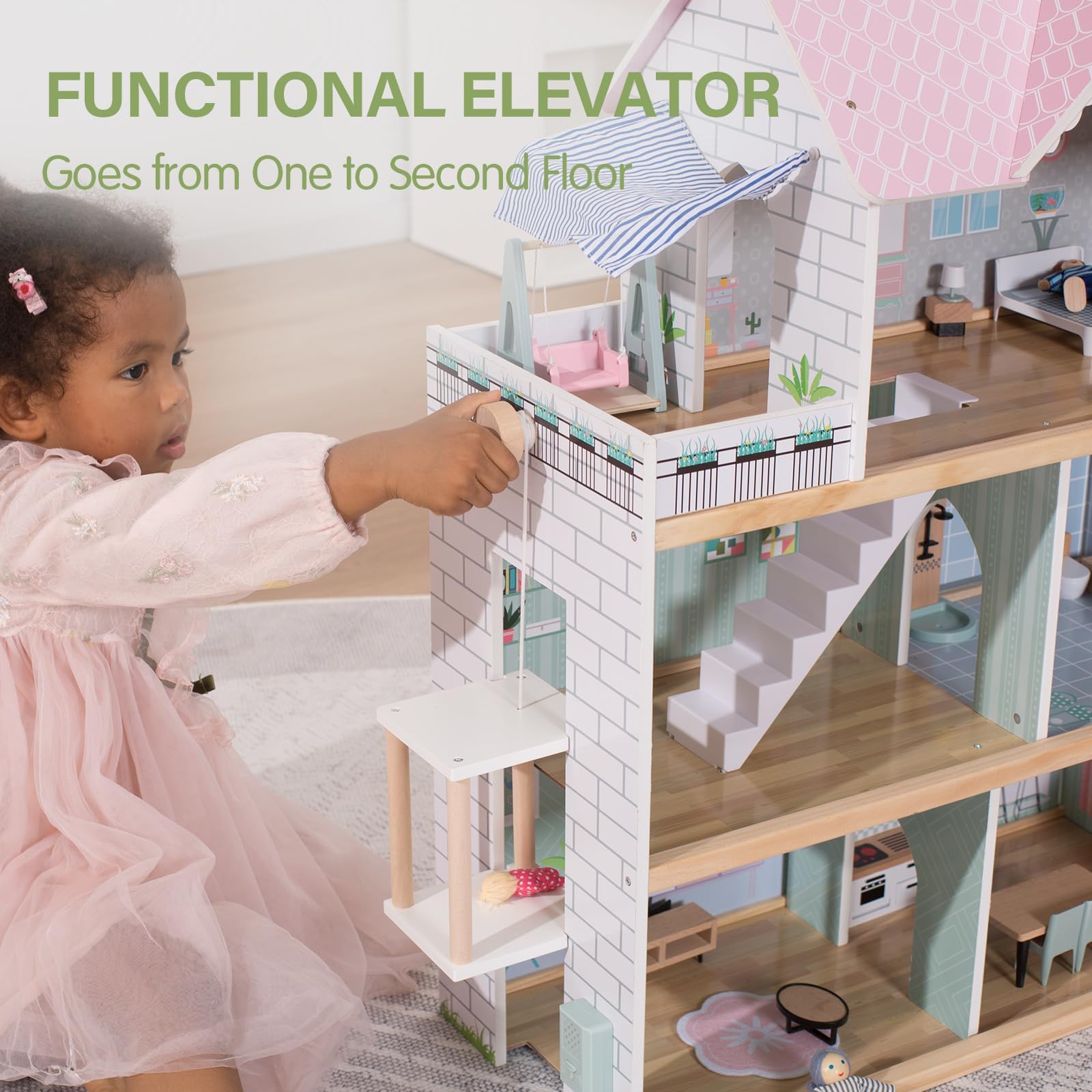- WOODEN MULTI-STORY HOUSE --The furnished Giant bean doll house playset is a perfect place for your dolls to live in. This 3-story house exterior with muted color ,measures 2.6 feet tall by 2 feet wide,5 rooms , a working elevator and balcony , all-angle play,22 accessories pieces . The house can fit in with family dolls around 5 inch height like from Beverly Hills Doll Collection, furniture around 7 inch height from Barbie , HAPE , Calico Critters and Gabby.