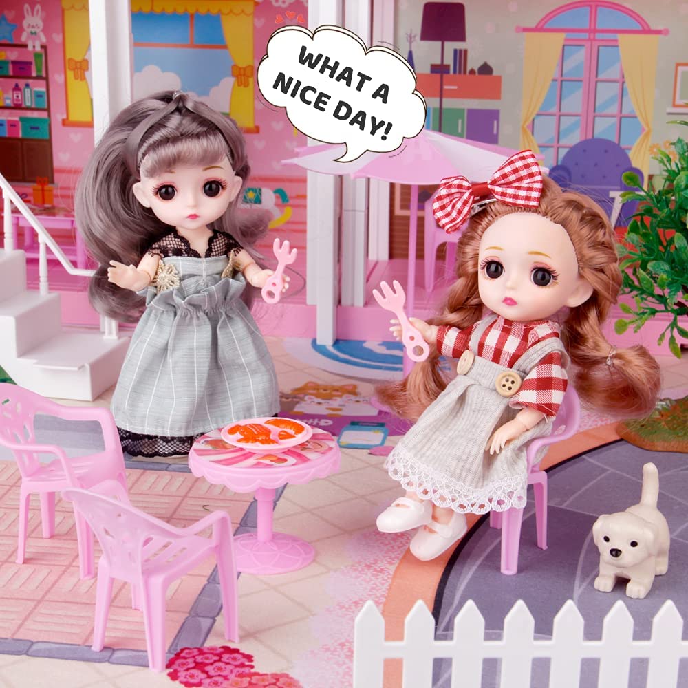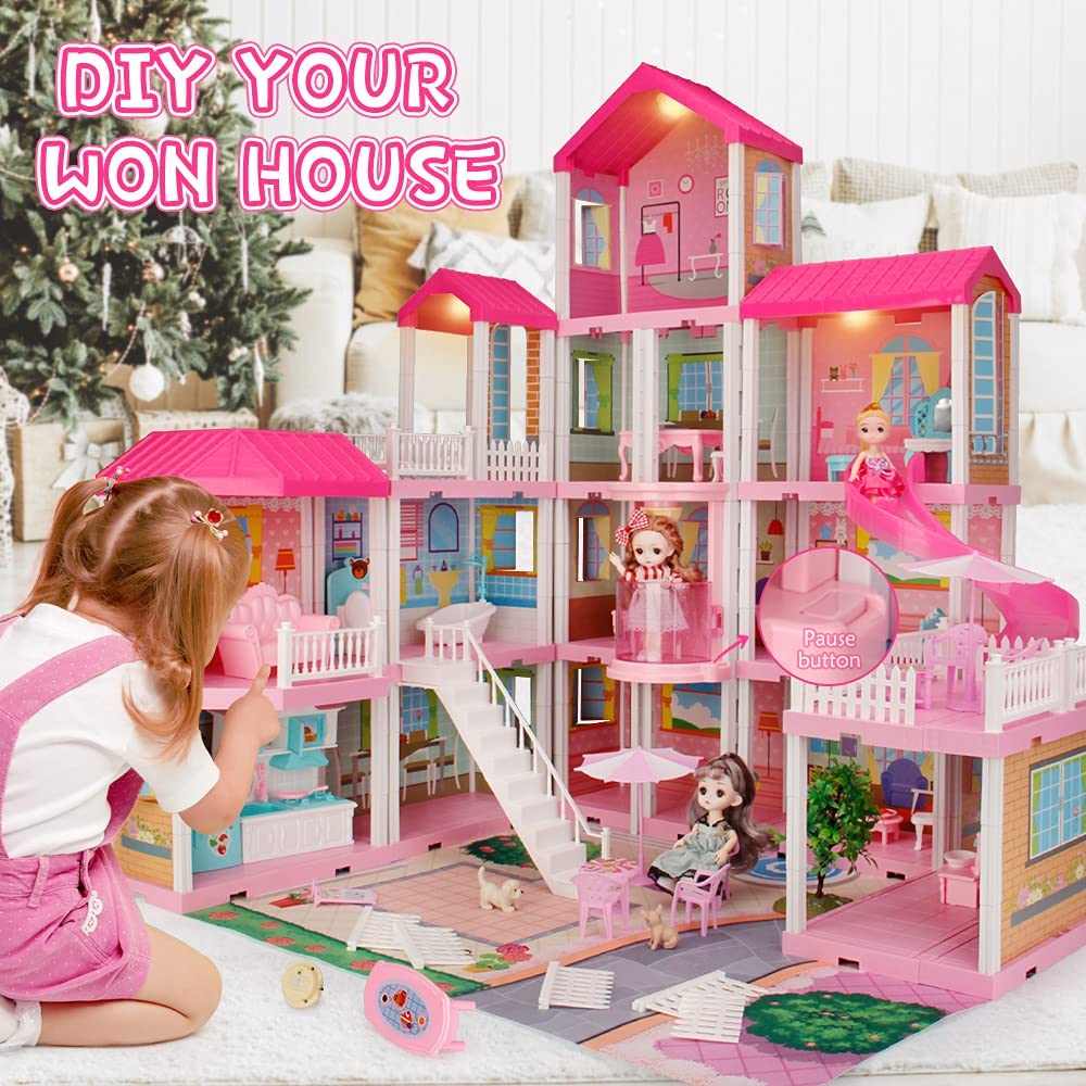 - u301013Rooms Doll House with Furnitureu3011This open sides dreamhouse with 13 creative rooms,including leisure courtyard,sky terrace,dressing room,bedroom,living room,bathroom,kitchen,locker room,balcony,elevator,stairway and rotating slide,ets.Three cute princess dolls live a happy life in this luxury castle with their pets.