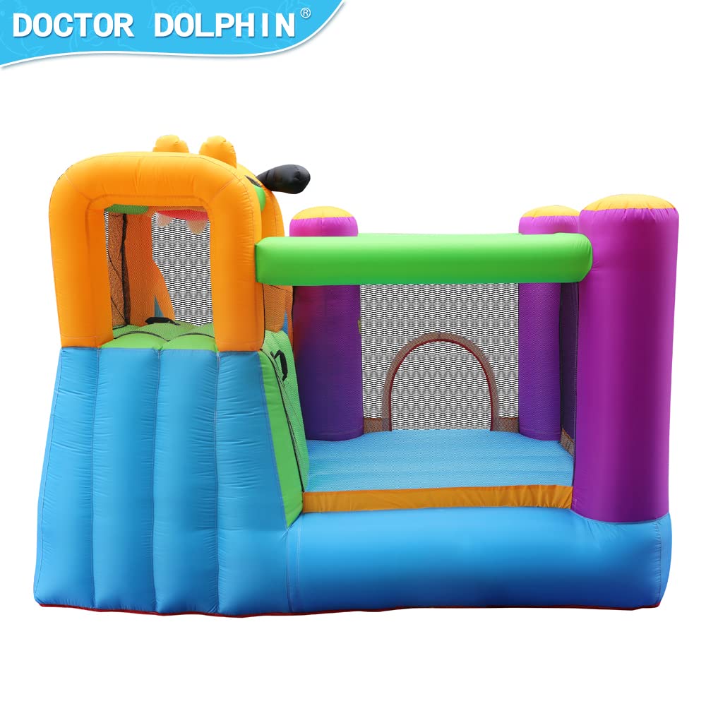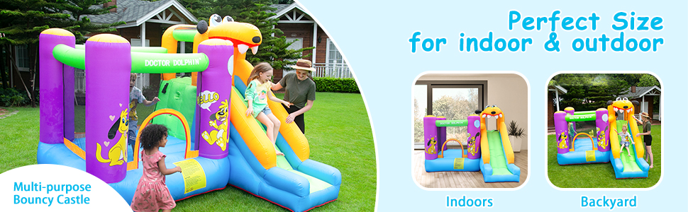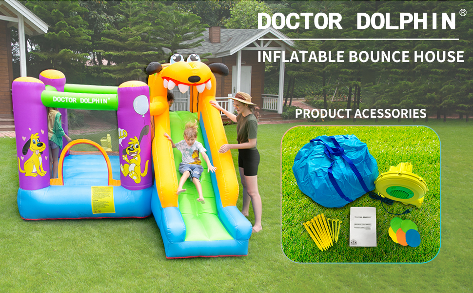 - Appearance Design: The appearance of the dog is cleverly used above the doctor dolphin bounce house to form a unique style, which in line with children's favorite, like a funny dog rolled over and over on the grass.