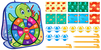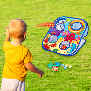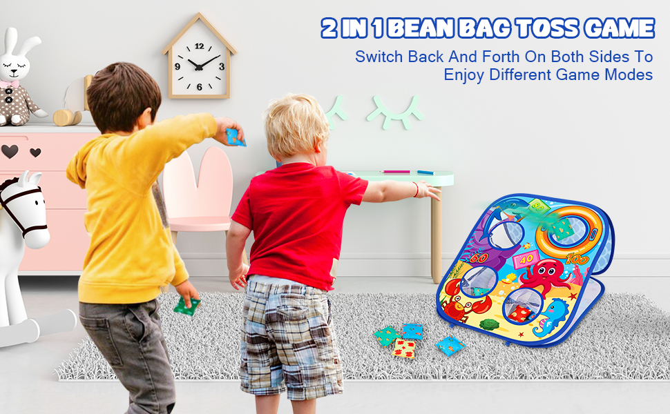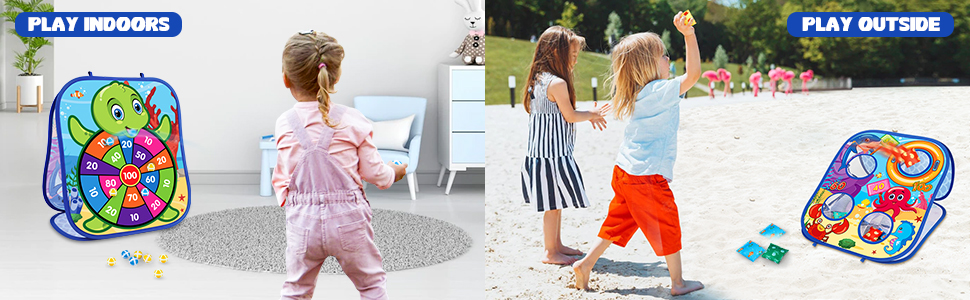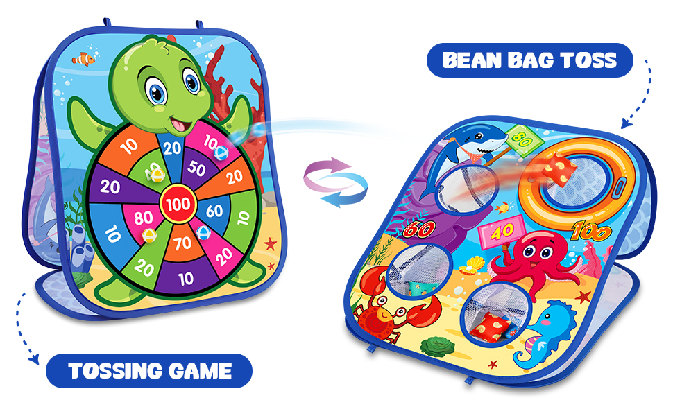 • ud83dudc22ud83eudd88 2 in 1 Bean Bag Toss Game Set: This Sea theme cornhole game combine 2 gameplay with easier horizontal bean bag toss game and harder vertical dart game, the two sides can switch back and forth to enjoy different game modes, it can exercise child's fine motor skills, stimulate their creativity and challenge